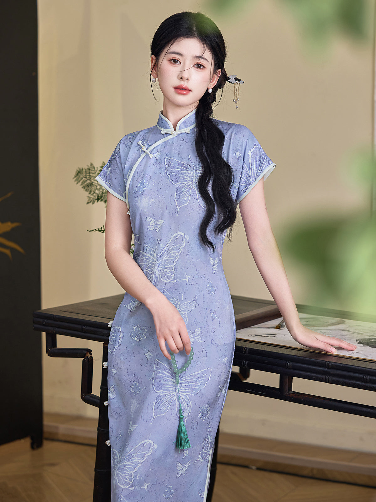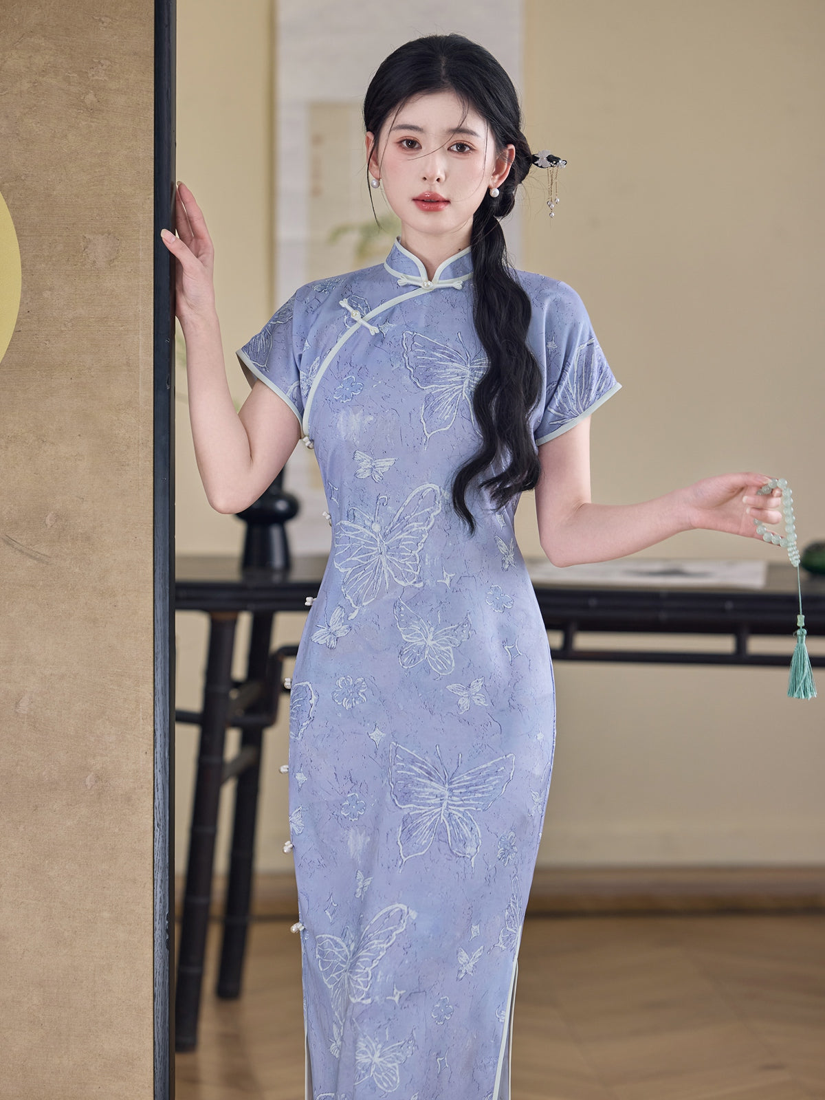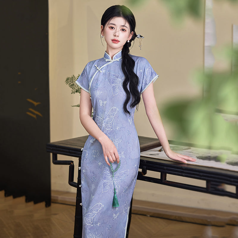 Acacia Butterfly - Short Sleeve Purple Long Cheongsam