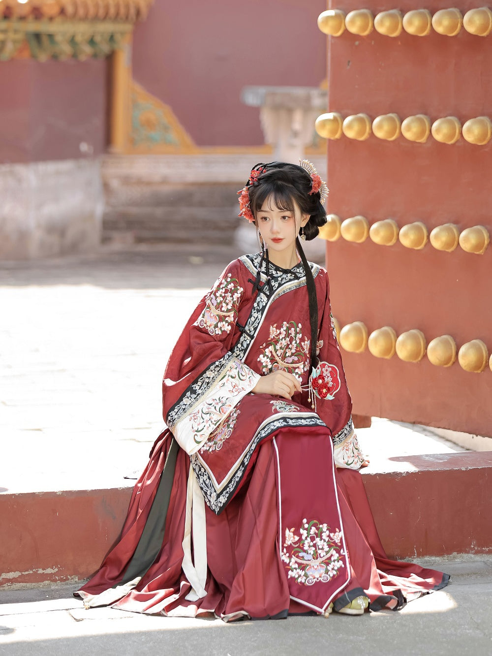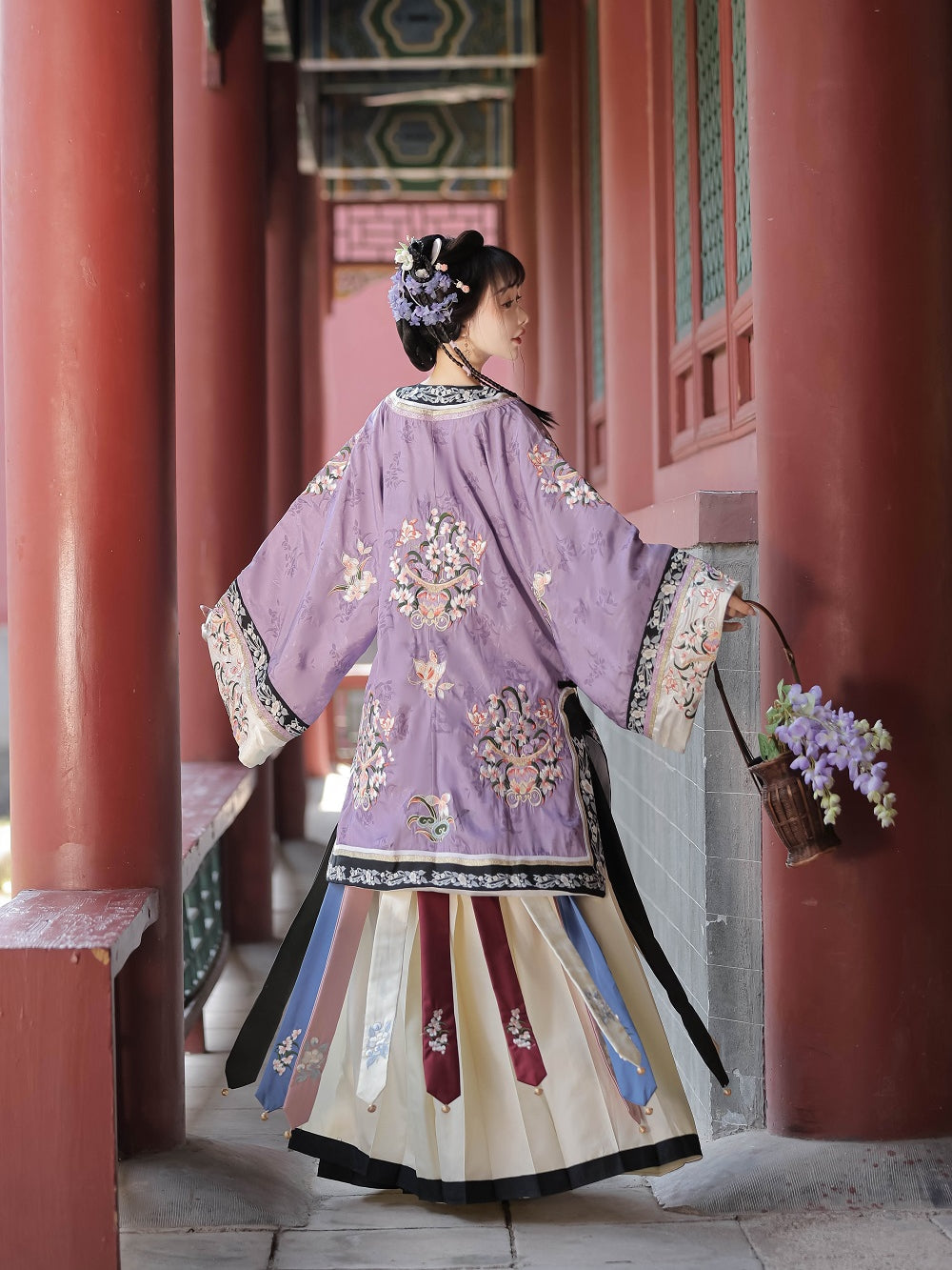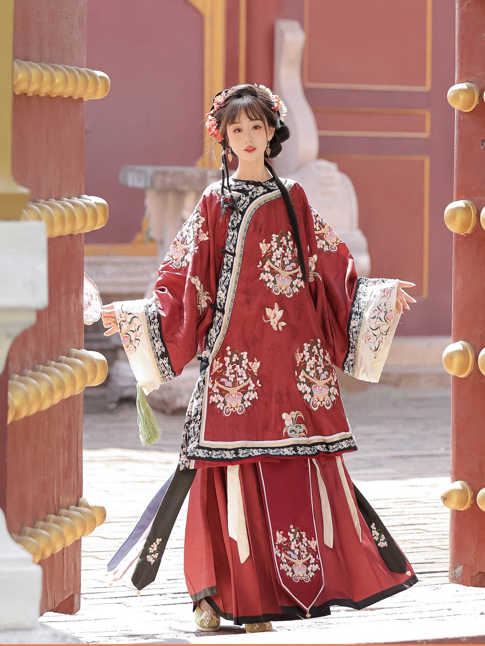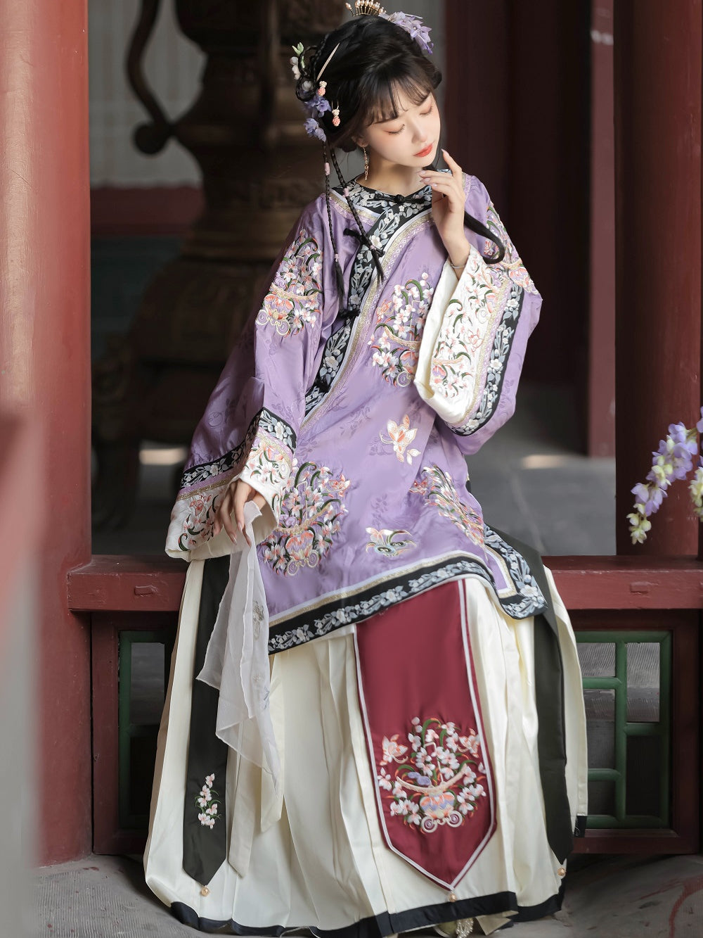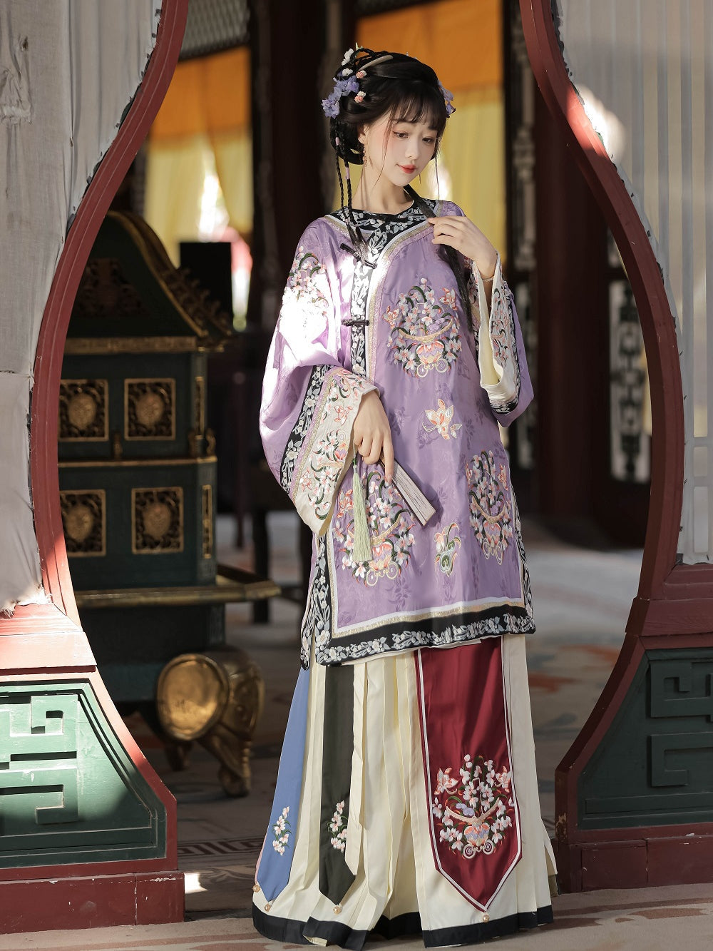 After the establishment of the Qing dynasty, the Manchu clothing system influenced Han clothing to some extent. However, Han women did not fully adopt Manchu-style qizhuang (banner attire) and instead preserved elements of Ming-style Han clothing, such as skirts, pleated skirts, and ruqun (blouse and skirt ensembles). That said, the structure, decoration, and tailoring of these garments evolved, making them distinct from traditional Hanfu. As a result, they are categorized as Qing dynasty Han women's attire rather than Hanfu.