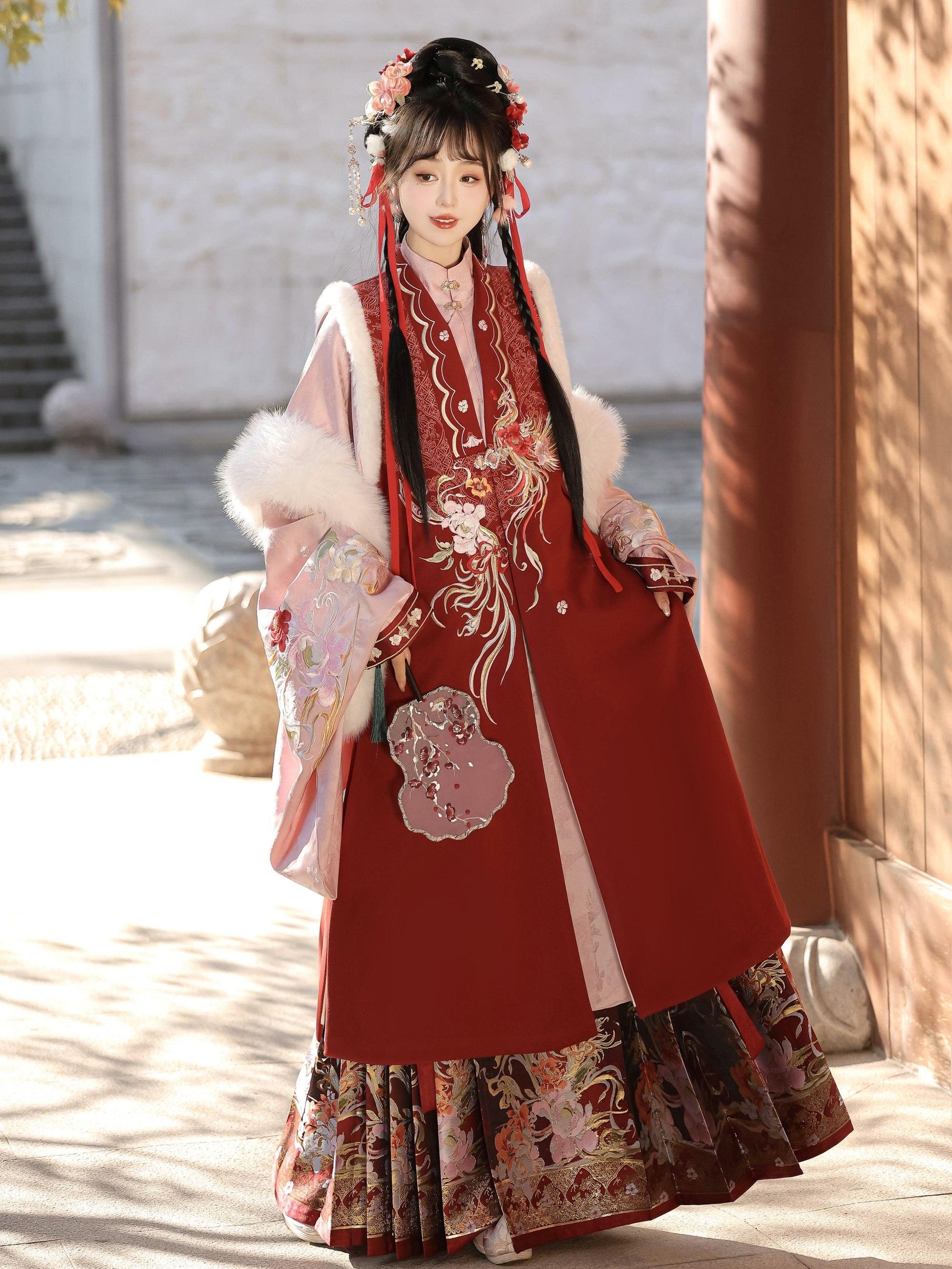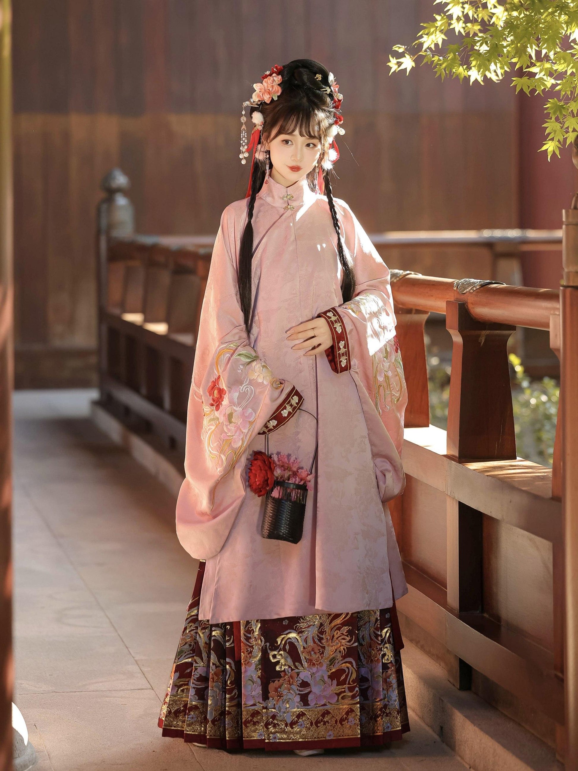 Shop Ming Dynasty women’s fashion, featuring structured Mamian skirts, embroidered cloud shoulders, and flowing robes. These historical Chinese garments are perfect for cultural events, festivals, performances, and even wedding or graduation ceremonies.