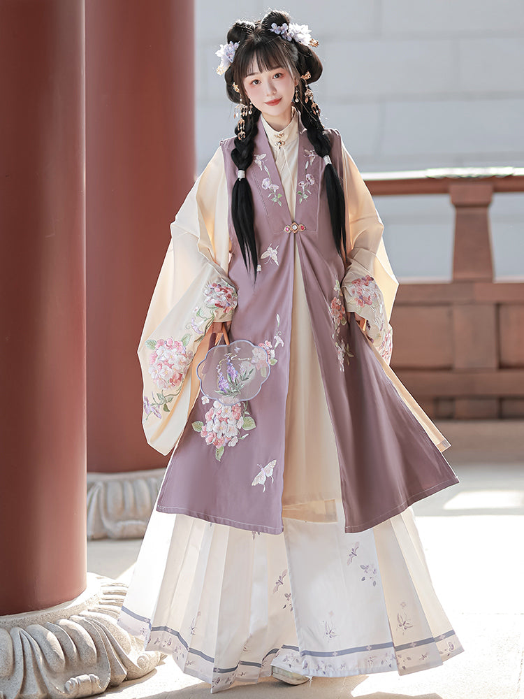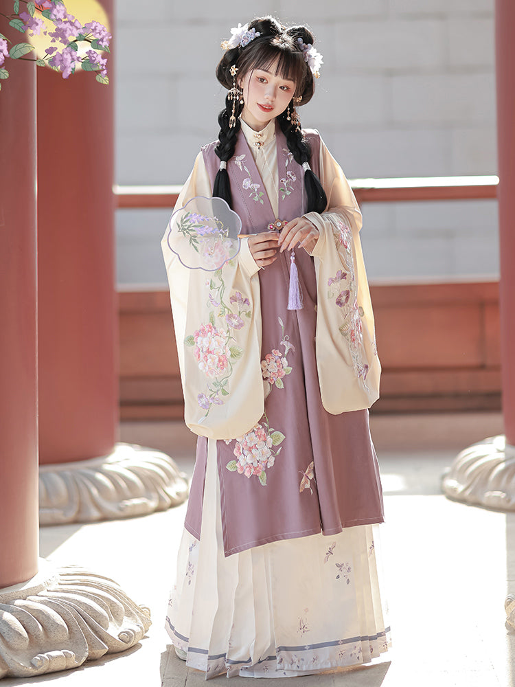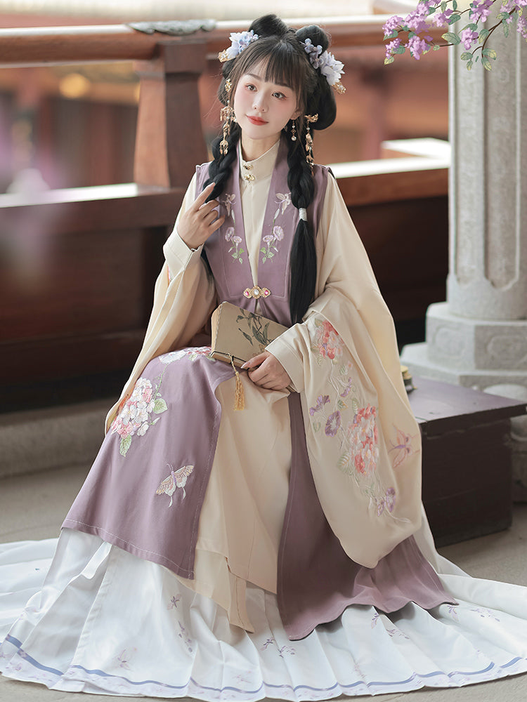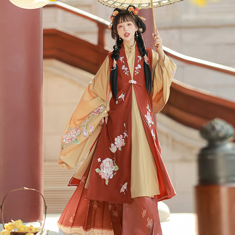 Shop Ming Dynasty women’s fashion, featuring structured Mamian skirts, embroidered cloud shoulders, and flowing robes. These historical Chinese garments are perfect for cultural events, festivals, performances, and even wedding or graduation ceremonies.