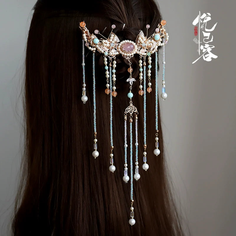 Hanfu hair accessories can vary widely in style, material, and design, but they all serve the purpose of enhancing the wearer's appearance and adding an extra touch of elegance to their hair. Some notable hair accessories commonly associated with Hanfu are hairpins (发簪, fāzān), hair combs (发篦, fābì), tassels (流苏, liúsū), hair ornaments (发髻, fājì), hairbands and headpieces (发饰, fāshì).