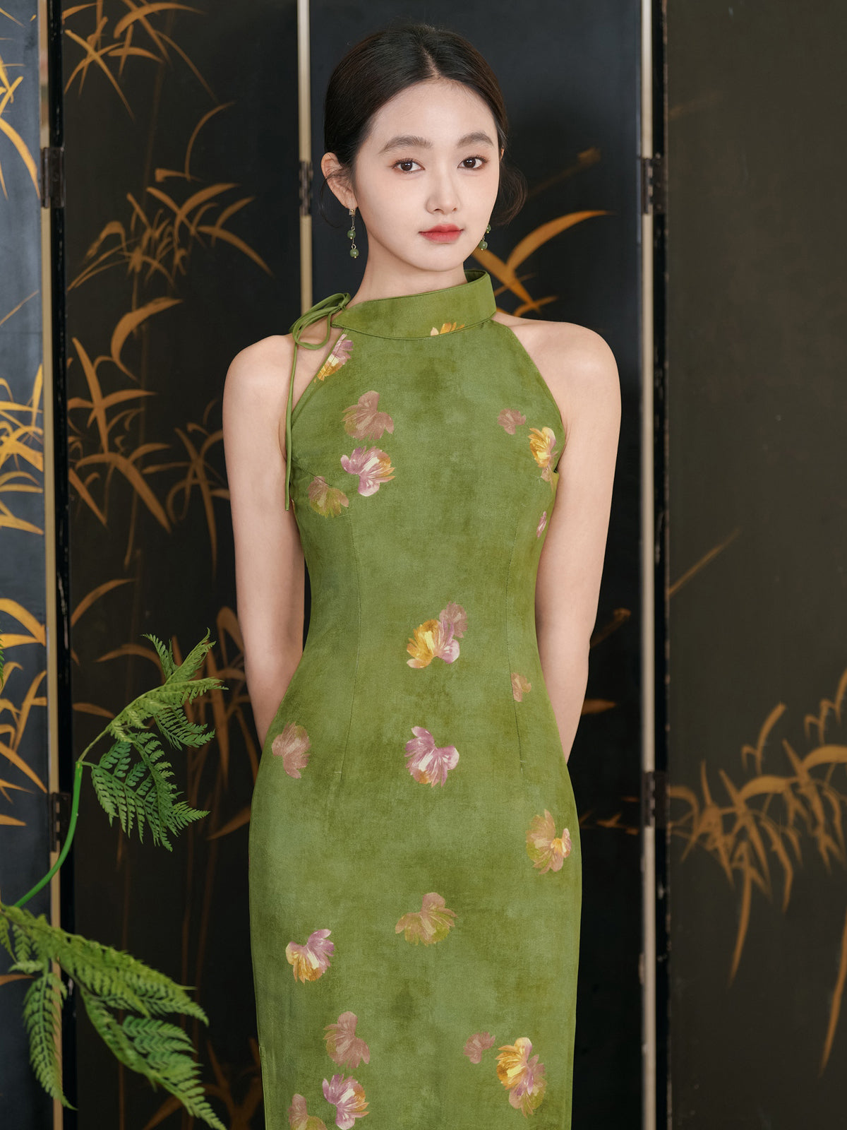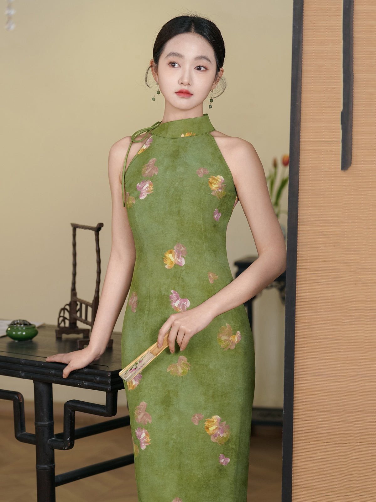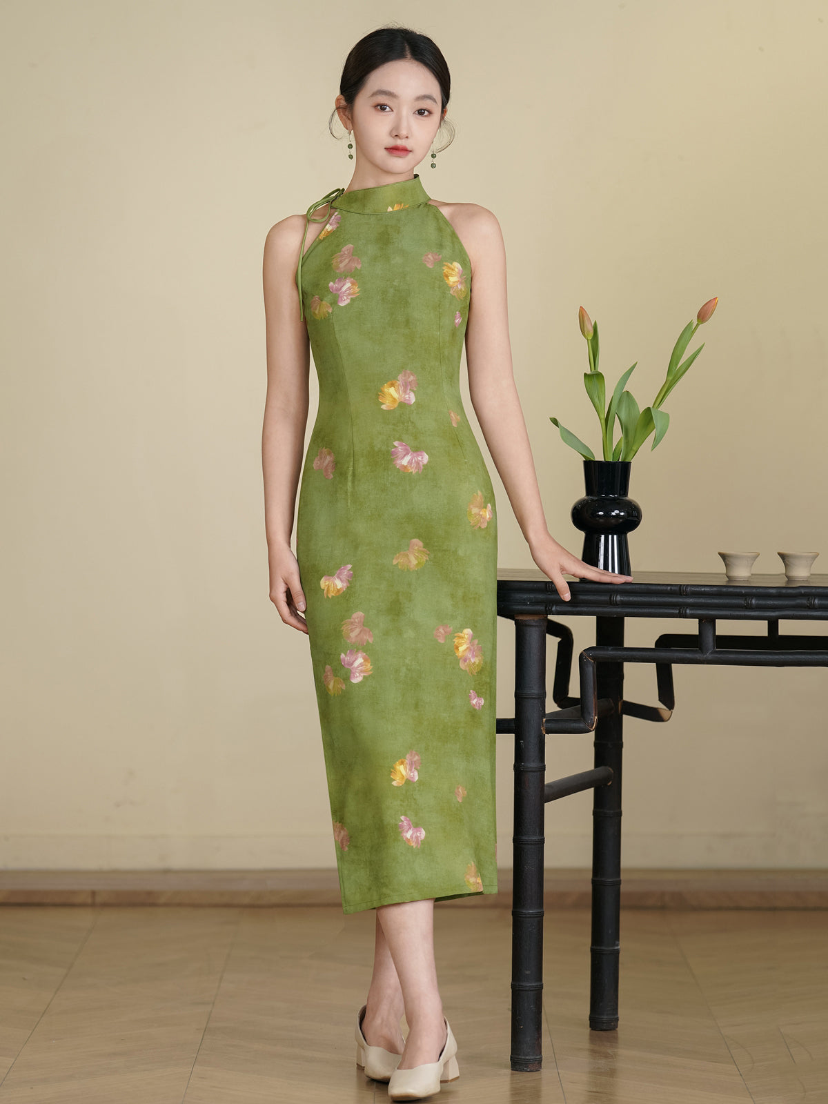 Biyu 碧玉流光 - Halter Neck Green Midi Cheongsam