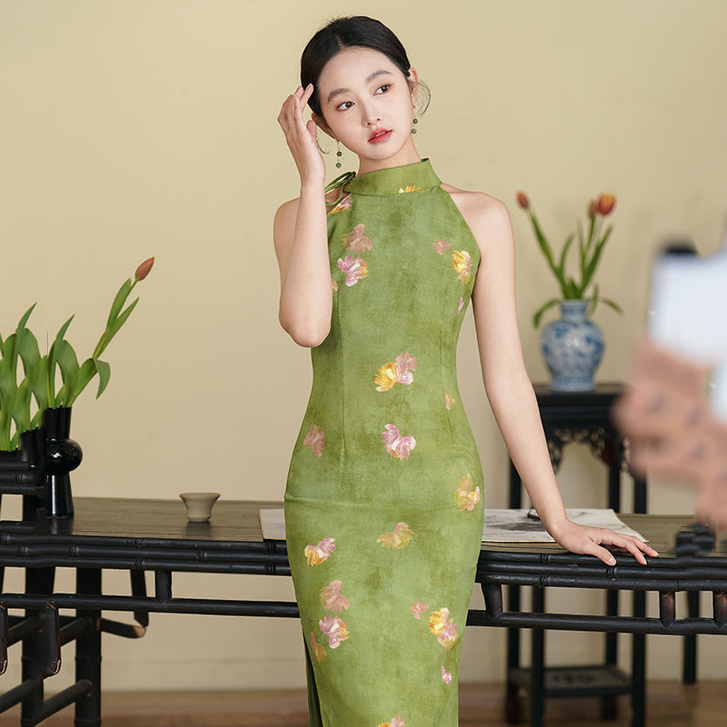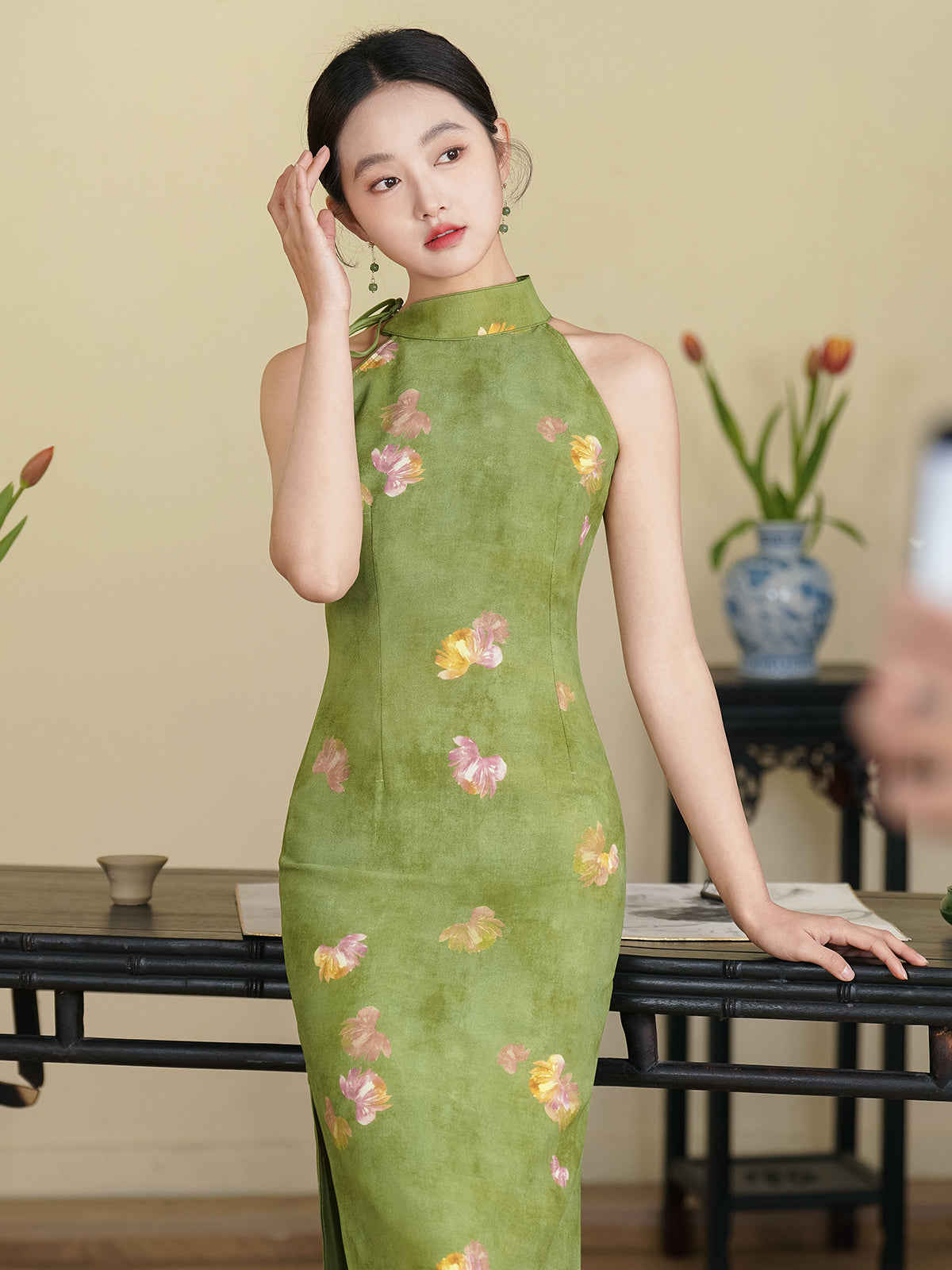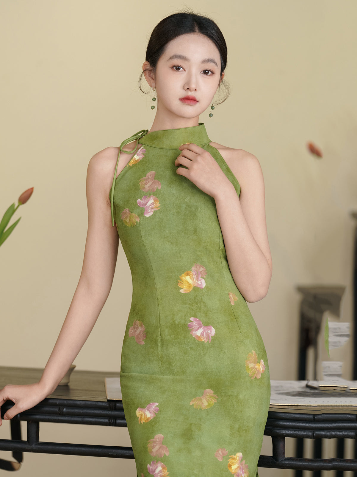 Biyu 碧玉流光 - Halter Neck Green Midi Cheongsam