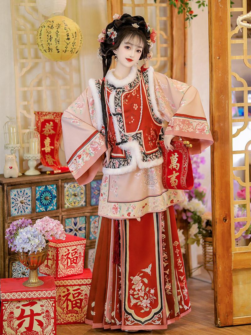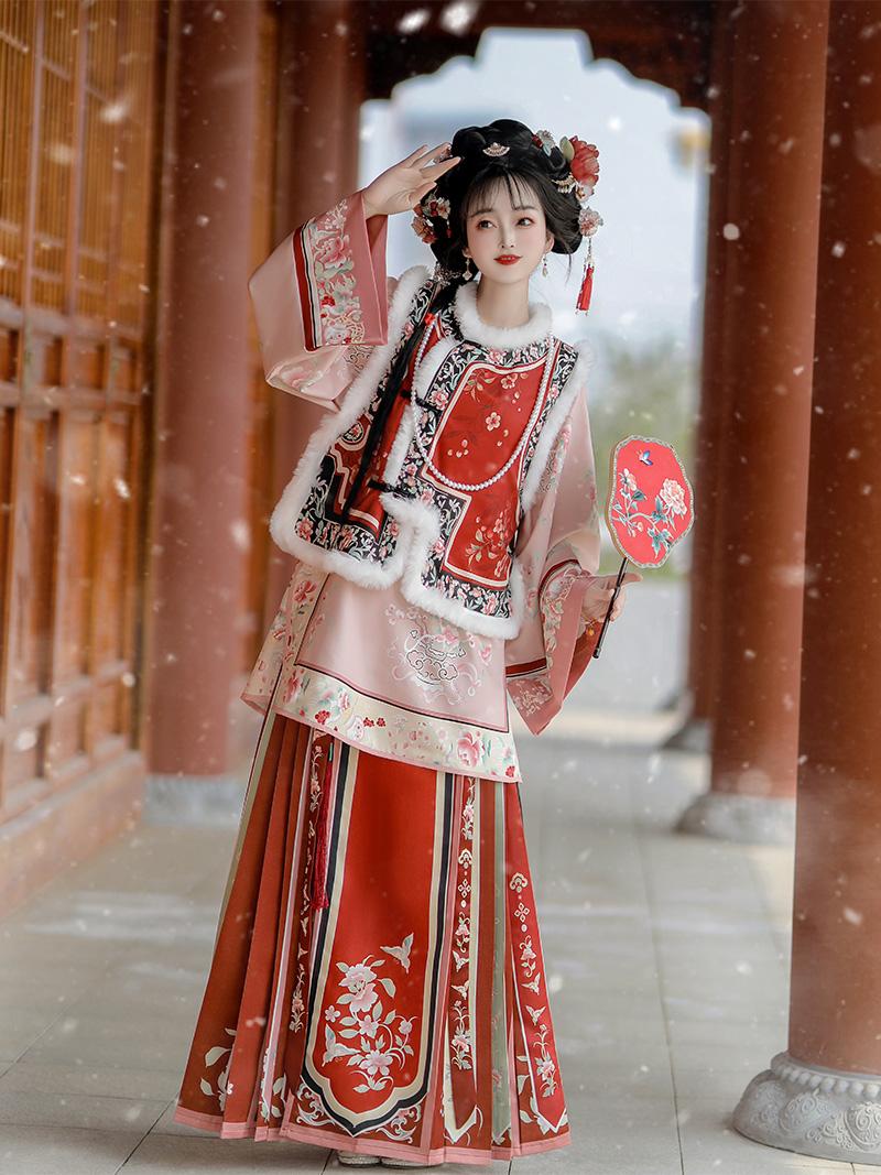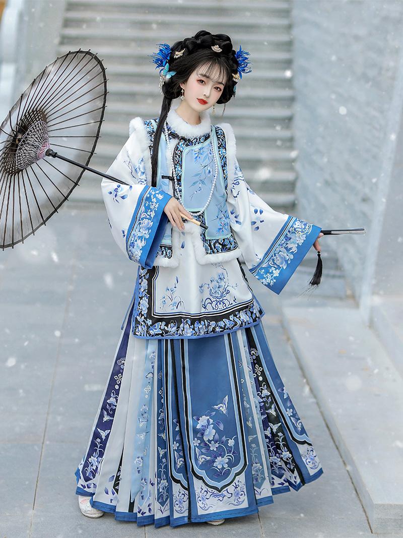 After the establishment of the Qing dynasty, the Manchu clothing system influenced Han clothing to some extent. However, Han women did not fully adopt Manchu-style qizhuang (banner attire) and instead preserved elements of Ming-style Han clothing, such as skirts, pleated skirts, and ruqun (blouse and skirt ensembles). That said, the structure, decoration, and tailoring of these garments evolved, making them distinct from traditional Hanfu. As a result, they are categorized as Qing dynasty Han women's attire rather than Hanfu.