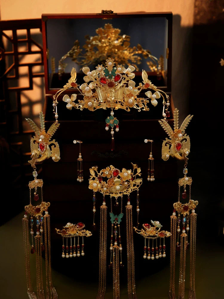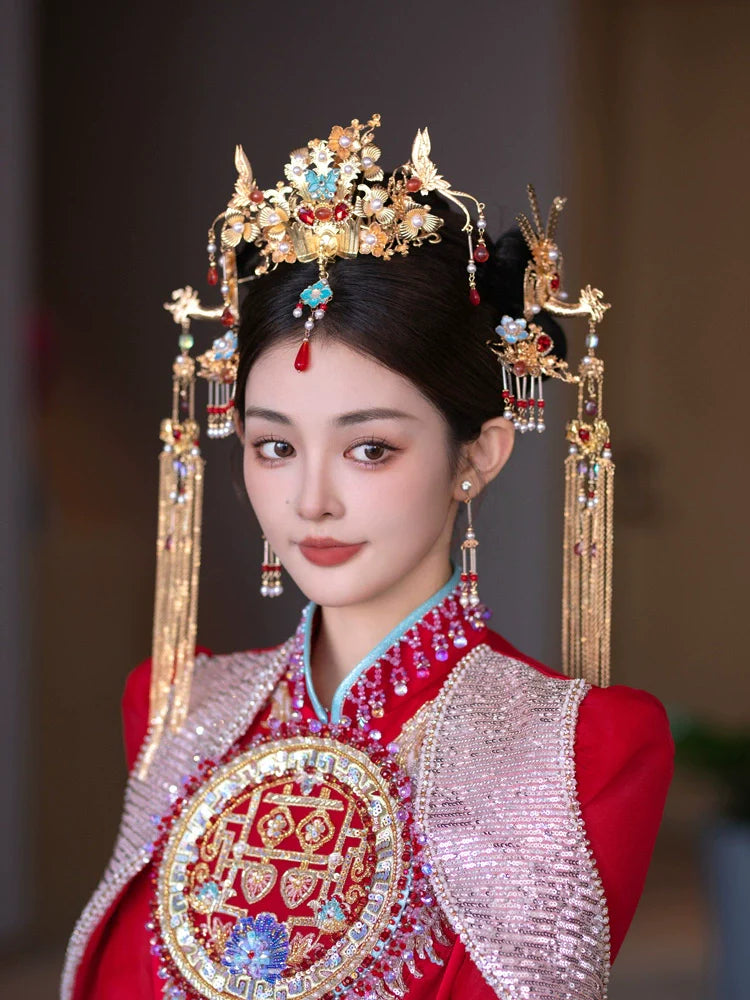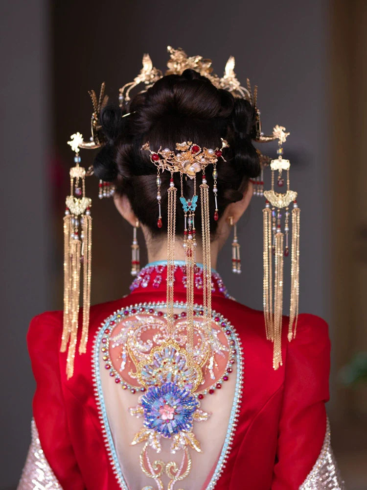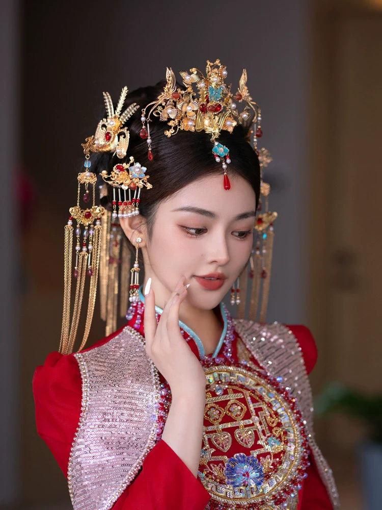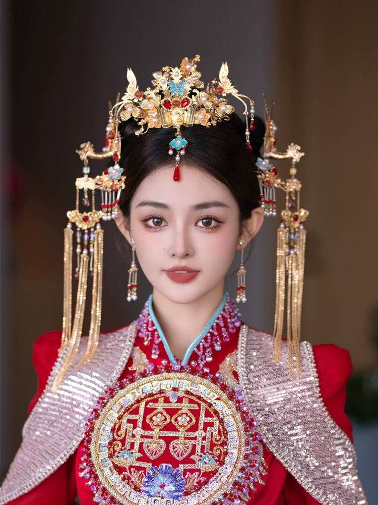 Complete your traditional Chinese wedding or tea ceremony look with our hair accessory sets, designed for brides. Each set features beautifully crafted hairpins, crowns, or headdresses, as shown in the photos, perfectly suited to complement your Hanfu, Cheongsam, or Qipao.