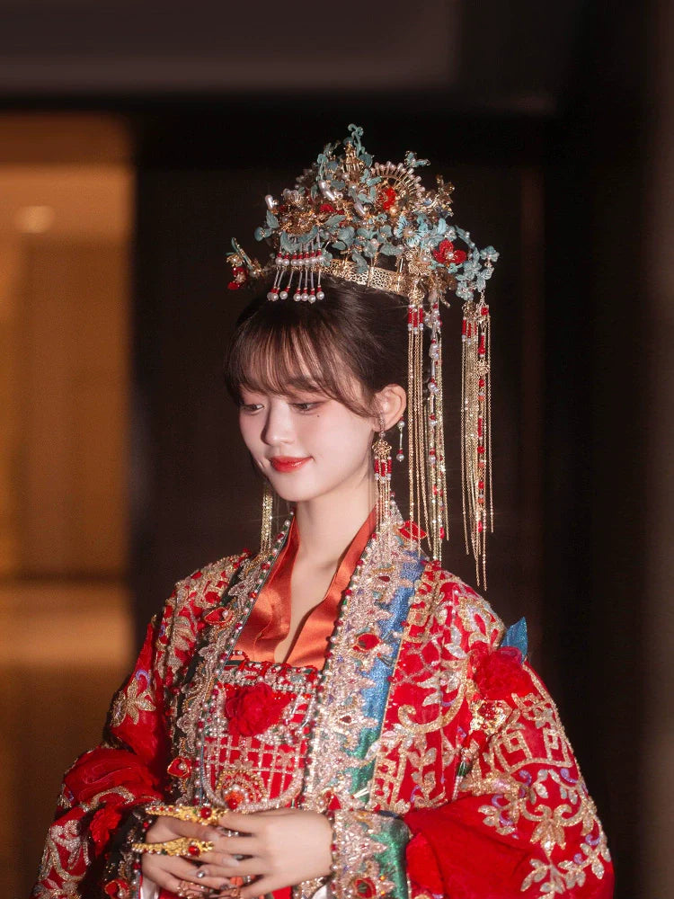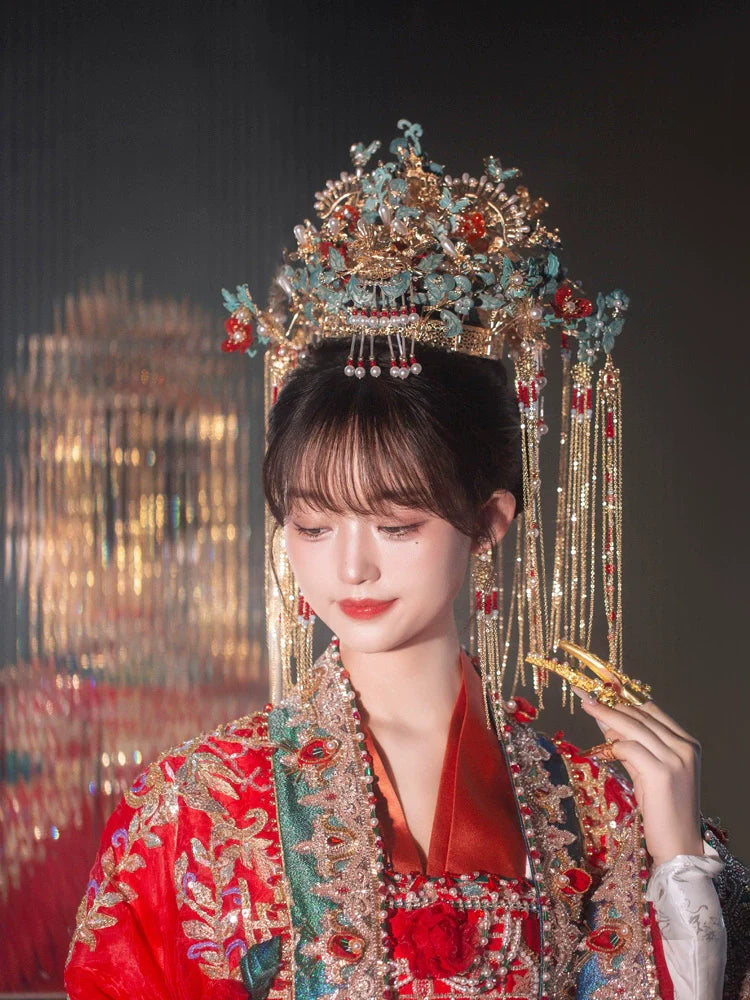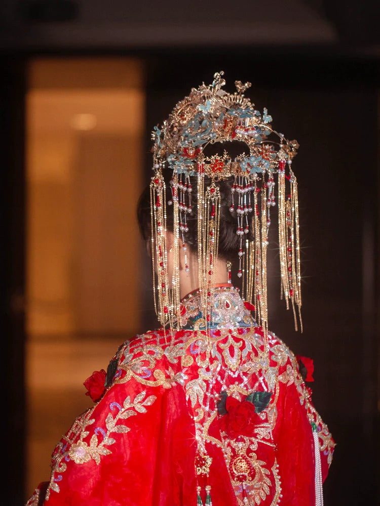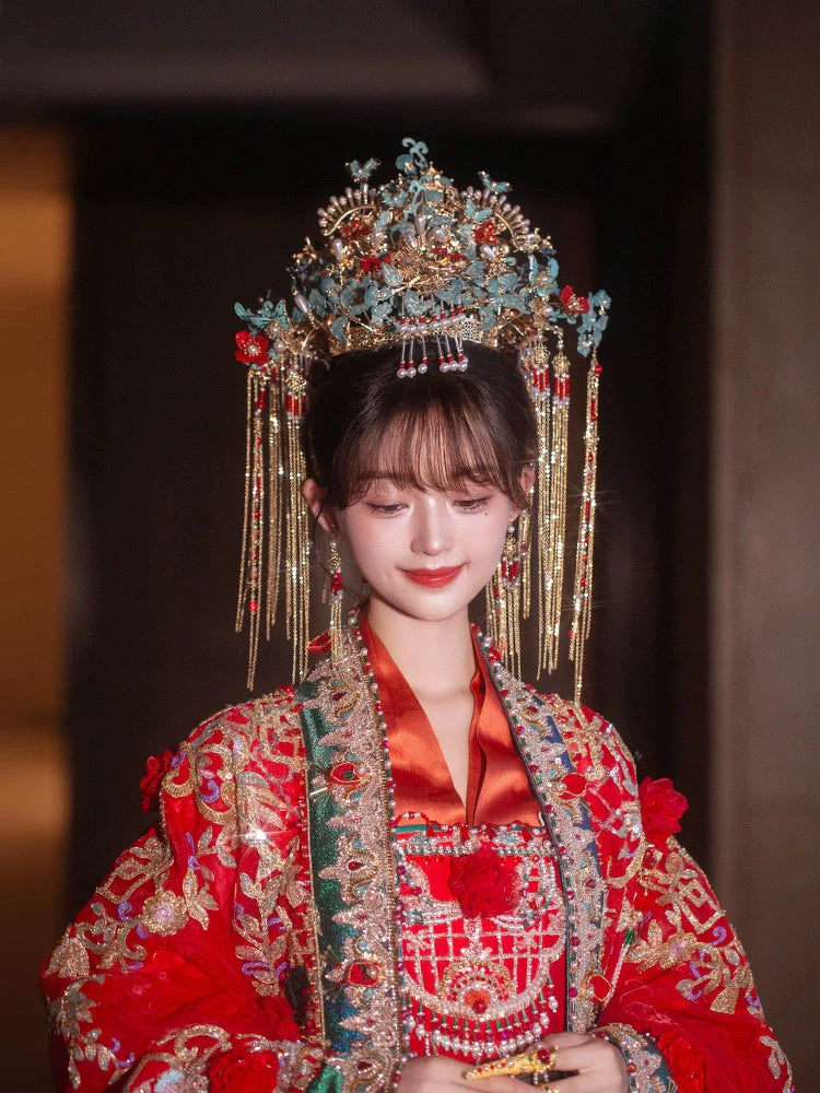 Complete your traditional Chinese wedding or tea ceremony look with our hair accessory sets, designed for brides. Each set features beautifully crafted hairpins, crowns, or headdresses, as shown in the photos, perfectly suited to complement your Hanfu, Cheongsam, or Qipao.