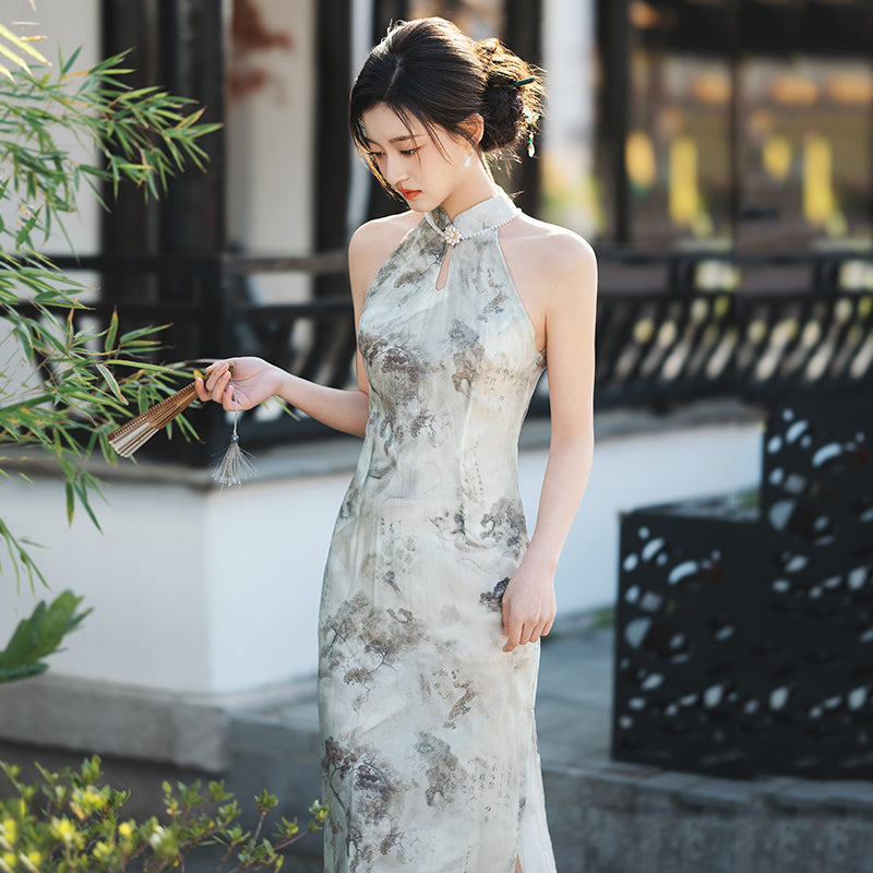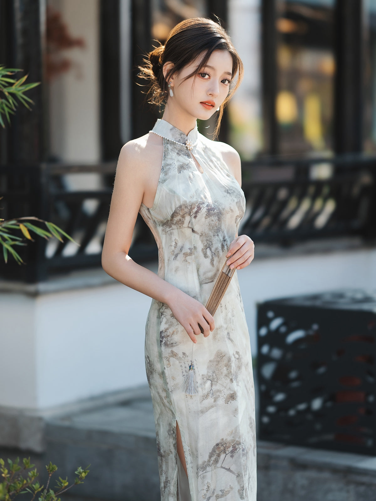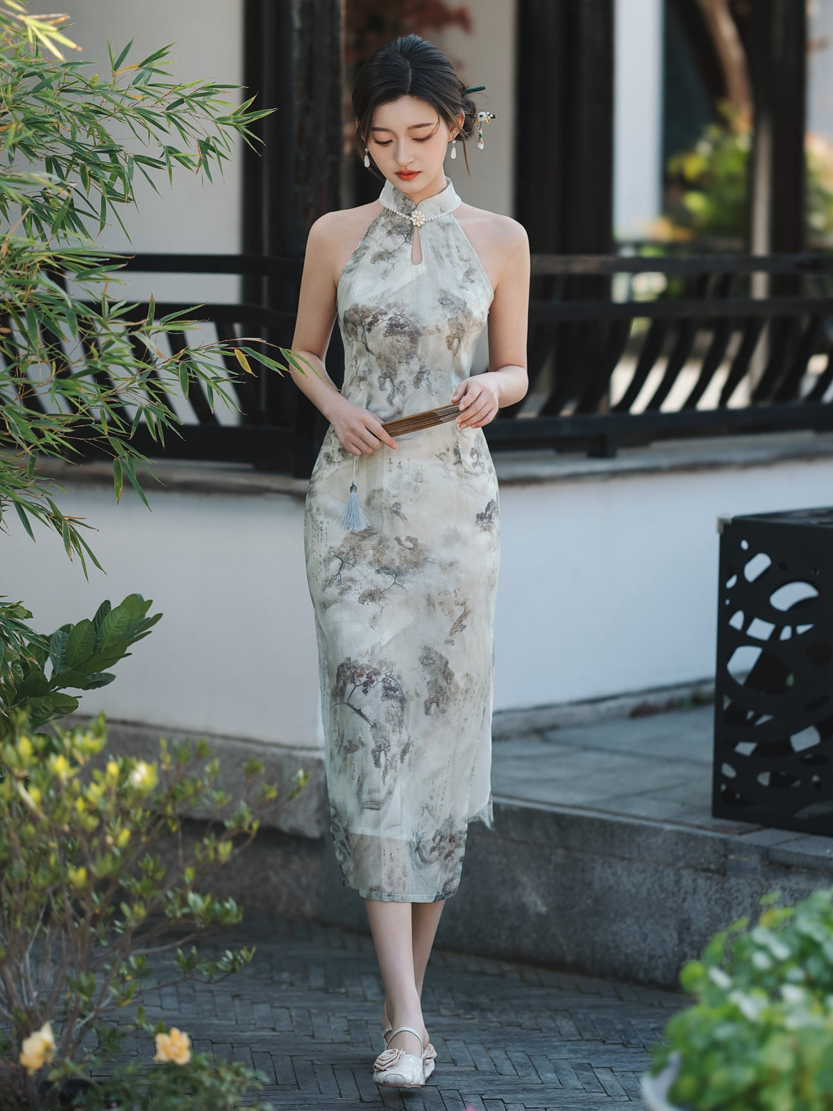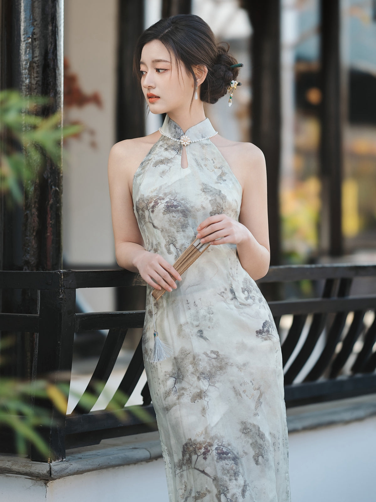Cold Ink 清冷水墨 - Halter Neck Midi Cheongsam