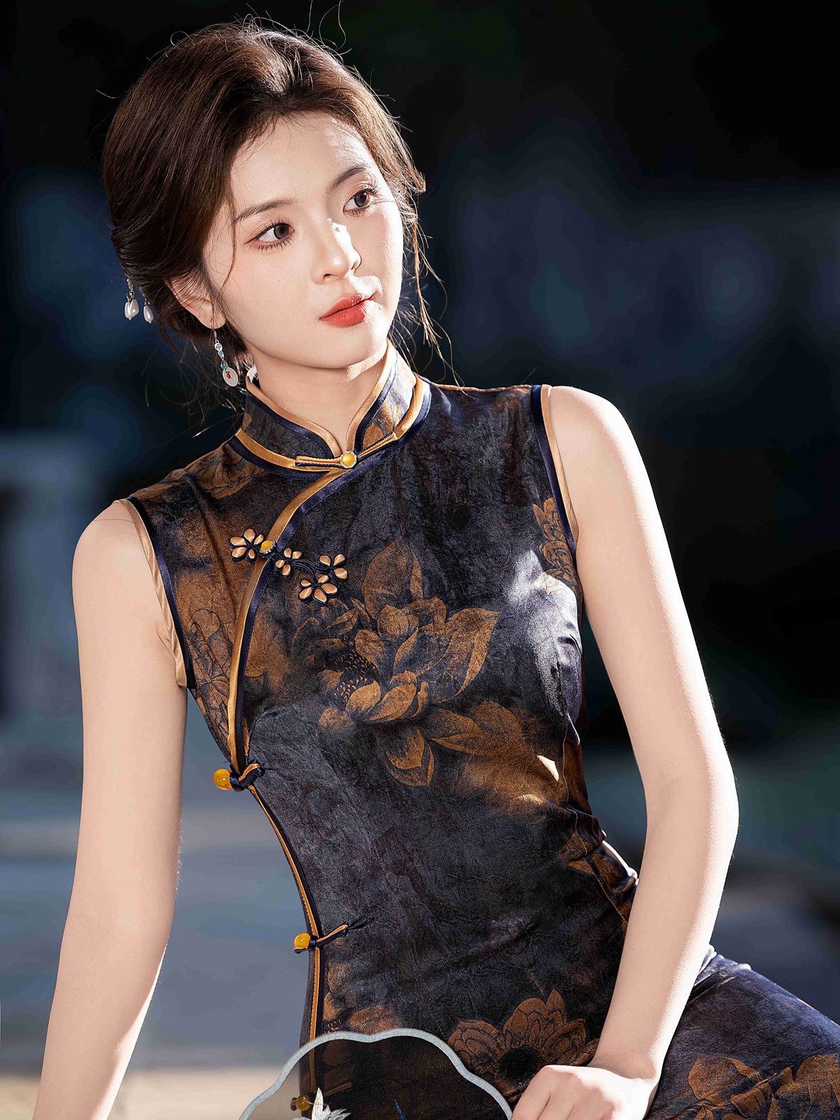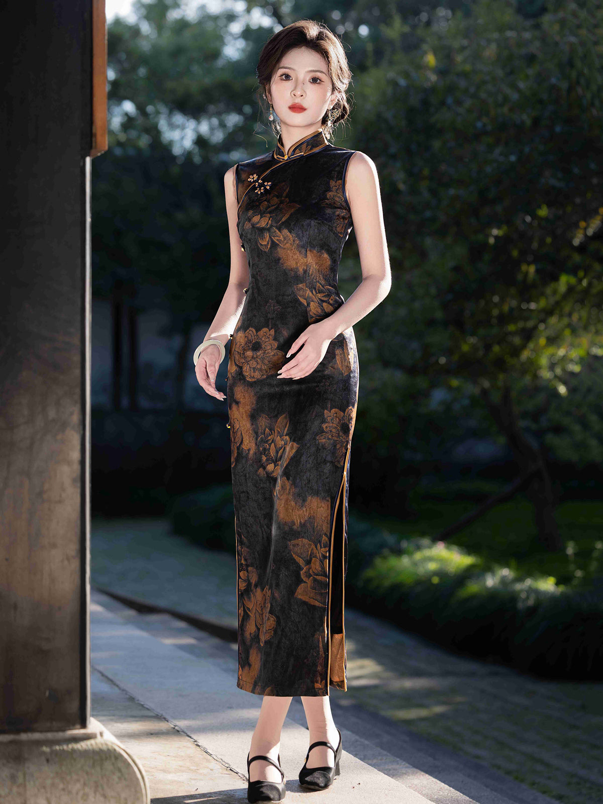 Copper Flowers - Sleeveless Black Satin Long Cheongsam