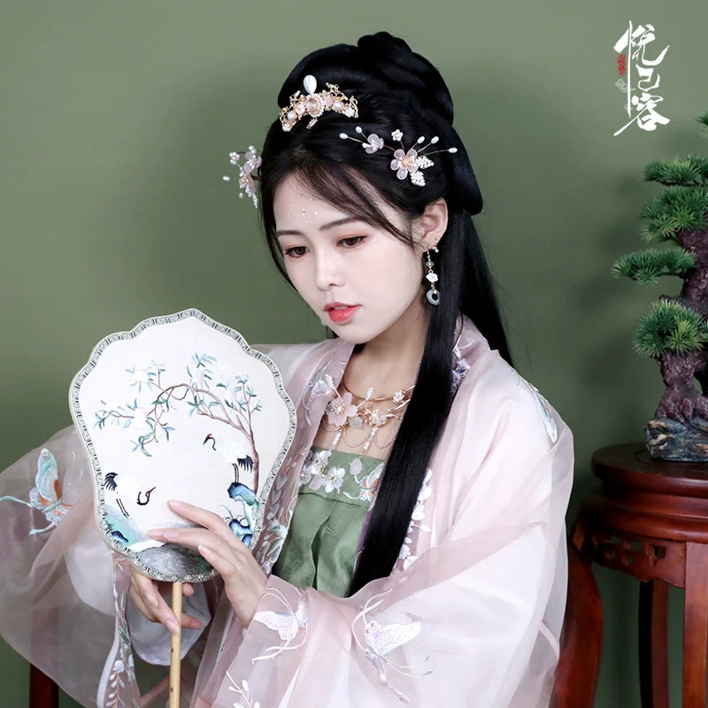 In traditional Hanfu culture, the hairstyle and the accompanying accessories are considered important elements that complete the overall look and reflect the wearer's social status, fashion sense, and personal style.