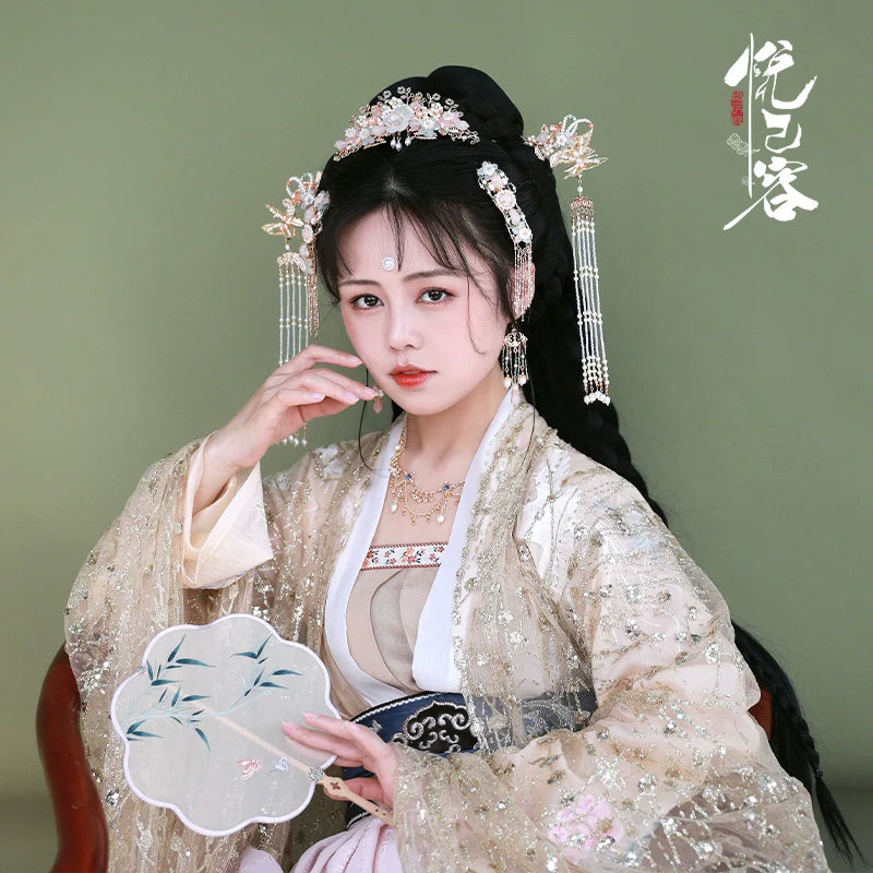 In traditional Hanfu culture, the hairstyle and the accompanying accessories are considered important elements that complete the overall look and reflect the wearer's social status, fashion sense, and personal style.