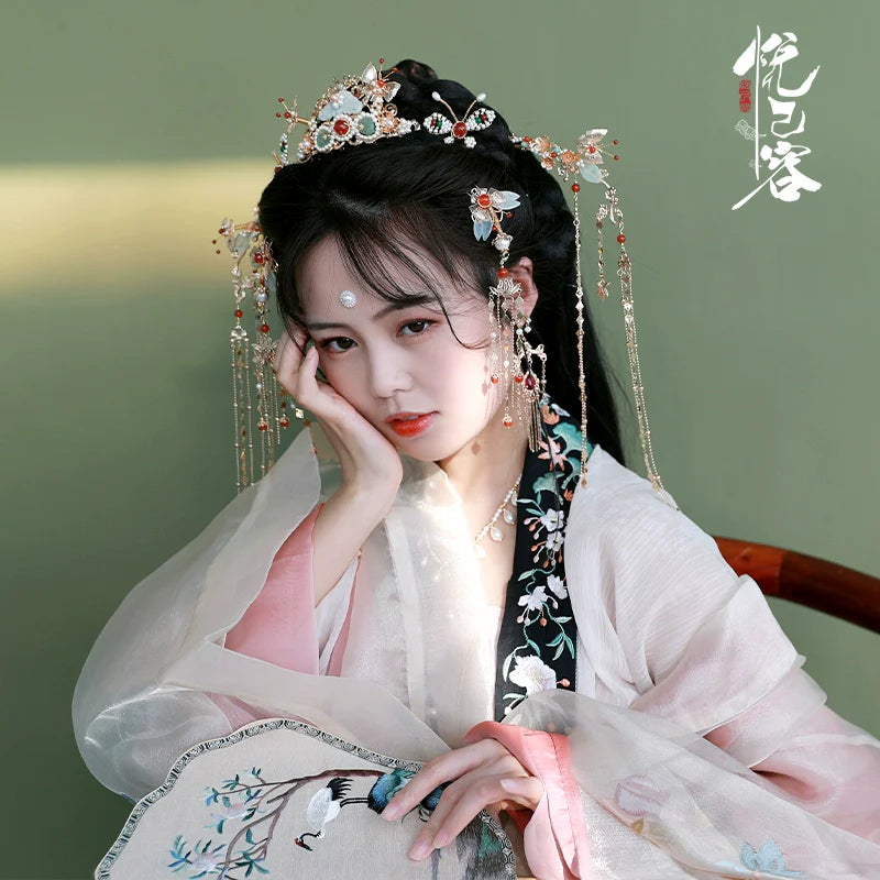 In traditional Hanfu culture, the hairstyle and the accompanying accessories are considered important elements that complete the overall look and reflect the wearer's social status, fashion sense, and personal style.