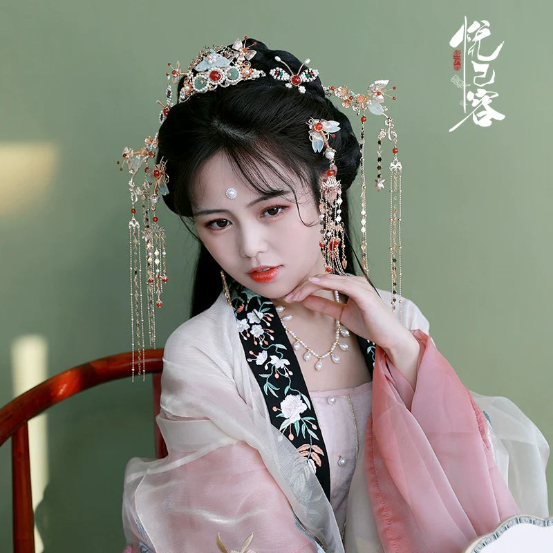 Hanfu hair accessories can vary widely in style, material, and design, but they all serve the purpose of enhancing the wearer's appearance and adding an extra touch of elegance to their hair. Some notable hair accessories commonly associated with Hanfu are hairpins (发簪, fāzān), hair combs (发篦, fābì), tassels (流苏, liúsū), hair ornaments (发髻, fājì), hairbands and headpieces (发饰, fāshì).
