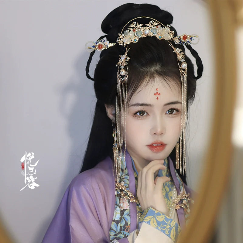 In traditional Hanfu culture, the hairstyle and the accompanying accessories are considered important elements that complete the overall look and reflect the wearer's social status, fashion sense, and personal style.