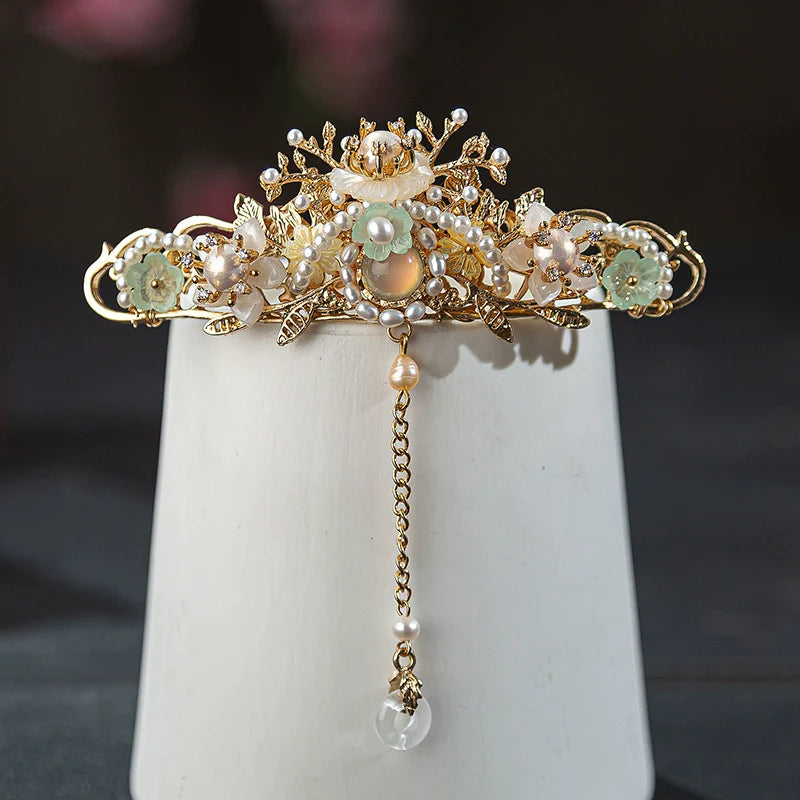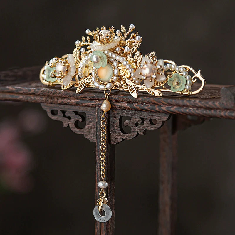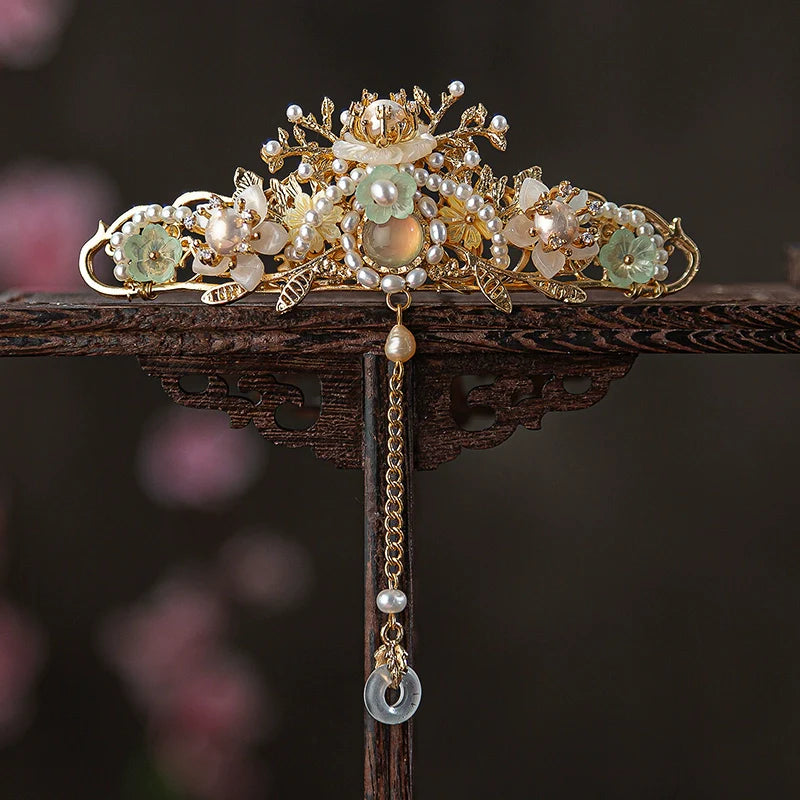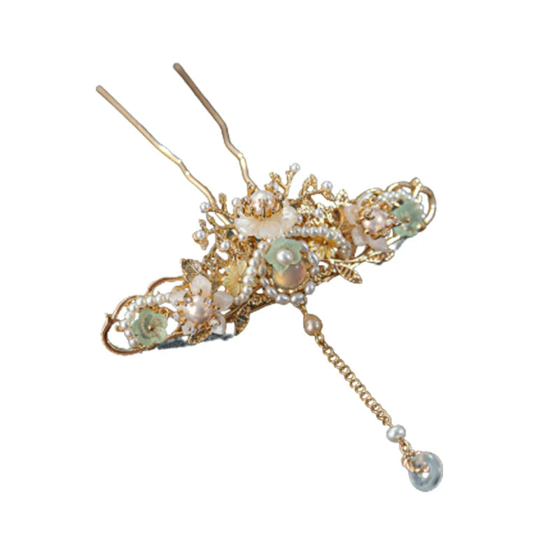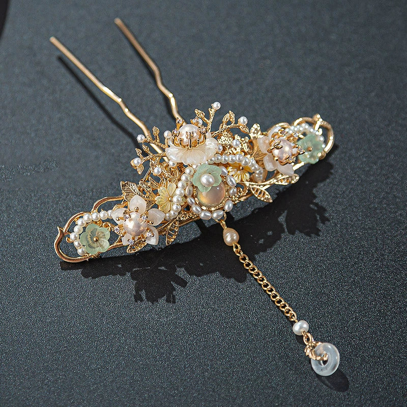 Hanfu hair accessories can vary widely in style, material, and design, but they all serve the purpose of enhancing the wearer's appearance and adding an extra touch of elegance to their hair. Some notable hair accessories commonly associated with Hanfu are hairpins (发簪, fāzān), hair combs (发篦, fābì), tassels (流苏, liúsū), hair ornaments (发髻, fājì), hairbands and headpieces (发饰, fāshì).