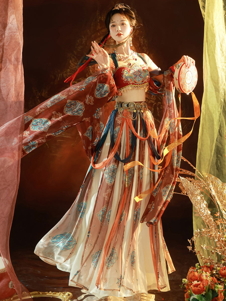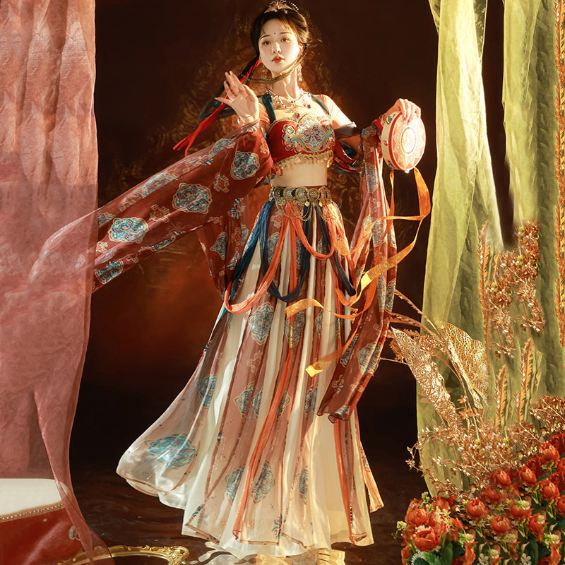 The Dunhuang costume is a traditional attire originating from the Dunhuang region in northwest China, along the historic Silk Road. This unique garment is a blend of Central Asian, Tibetan, Indian, and Chinese influences, highlighting the rich cultural interactions that took place in the area. Characterized by its vibrant colors, the costume embodies the region's artistic aesthetics and beliefs. Wearing this attire allows you to connect with the past, celebrate cultural diversity, and appreciate the timeless beauty that crosses both time and borders.