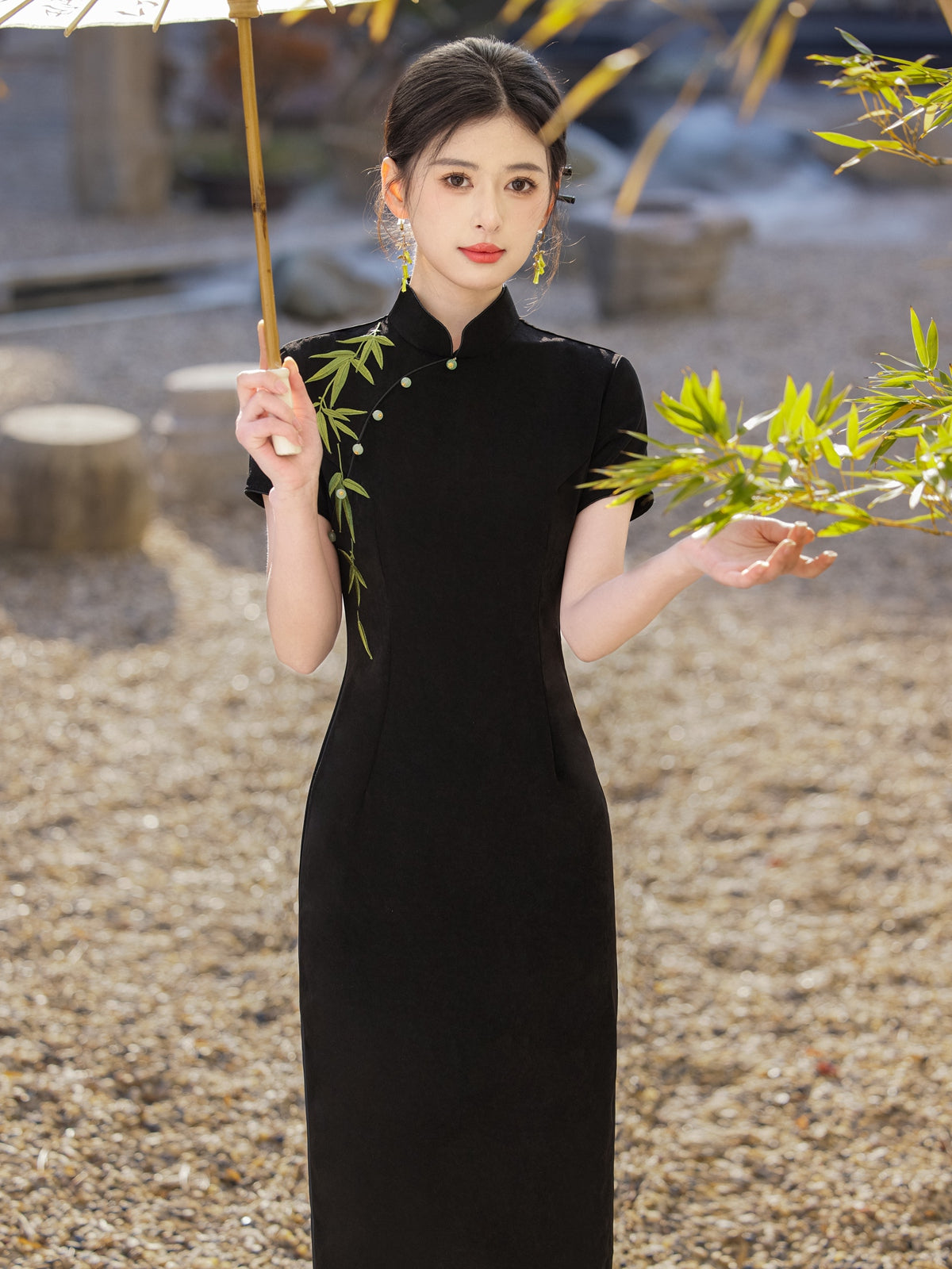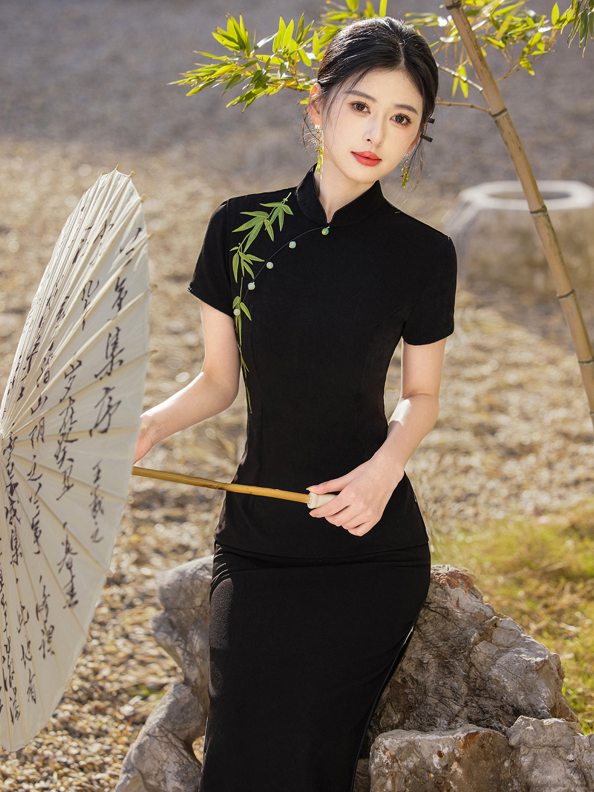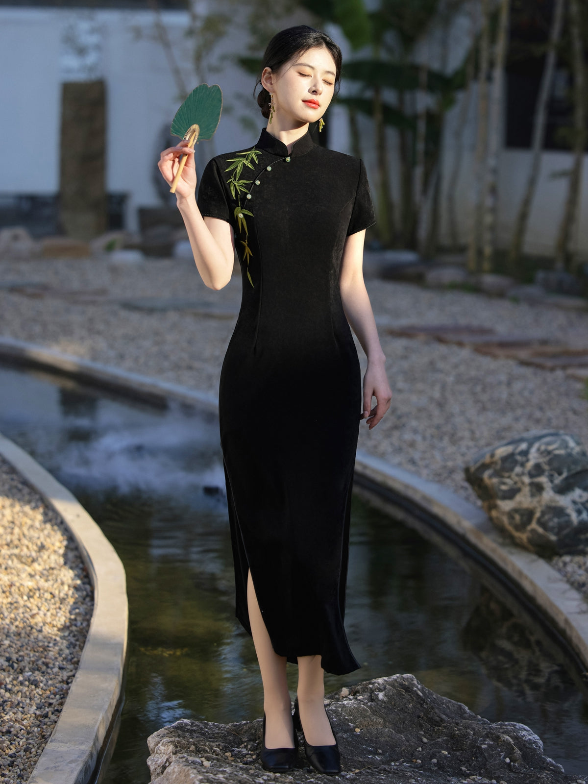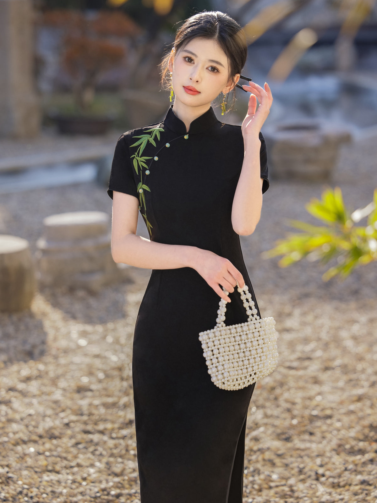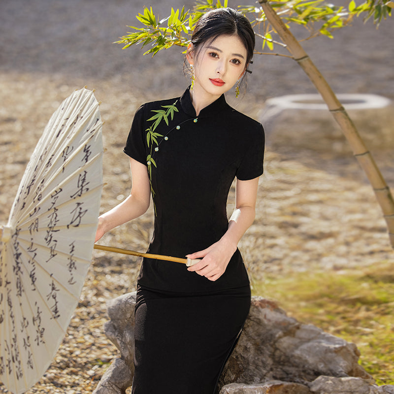 Embroidered Bamboo - Short Sleeve Long Black Cheongsam