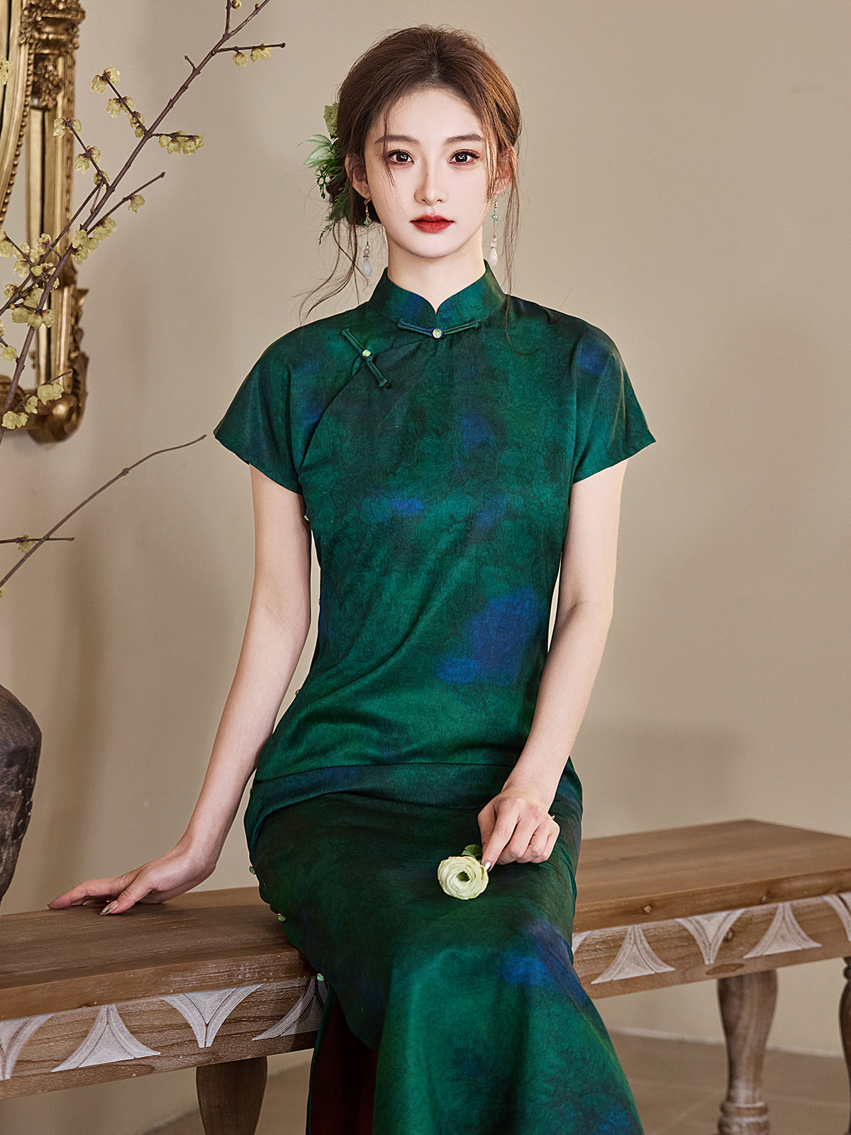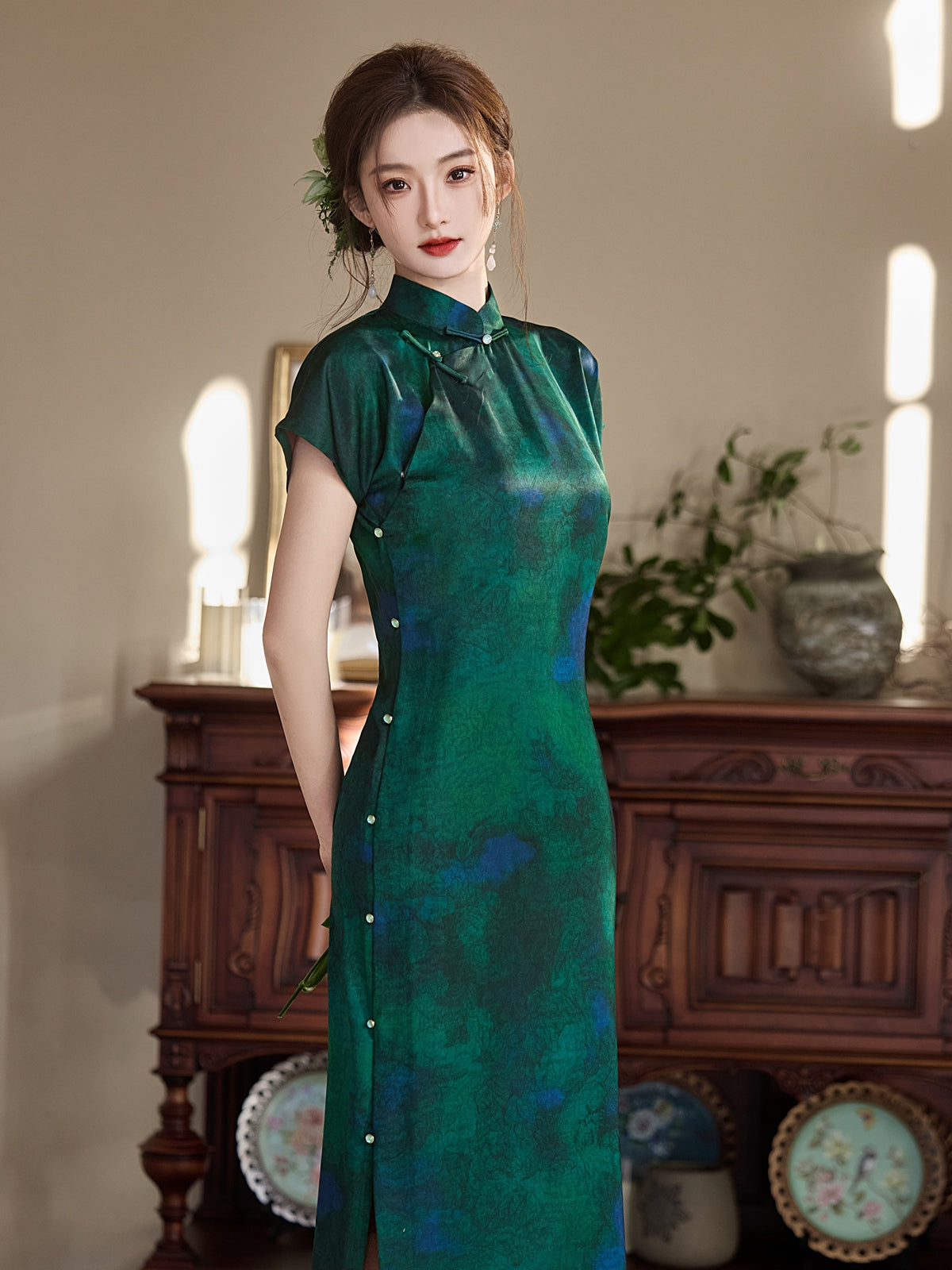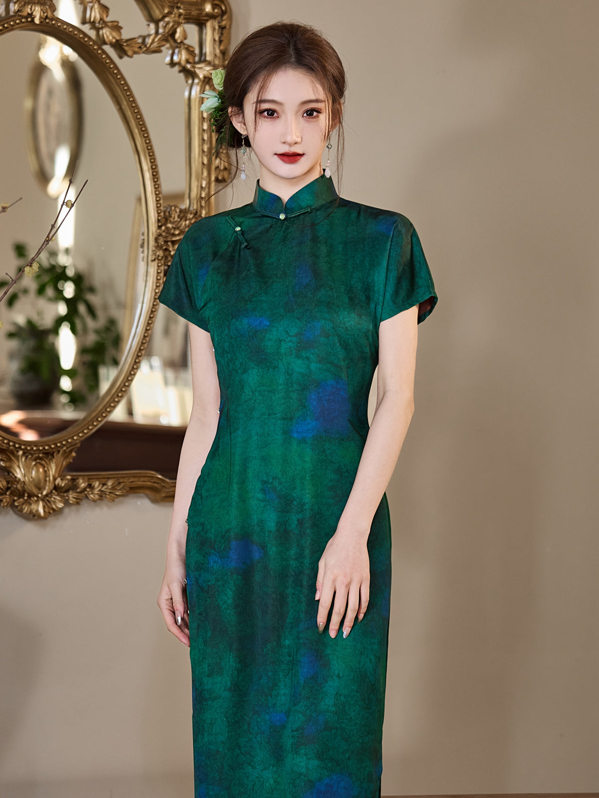 Emeraldine - Short Sleeve Green Long Cheongsam