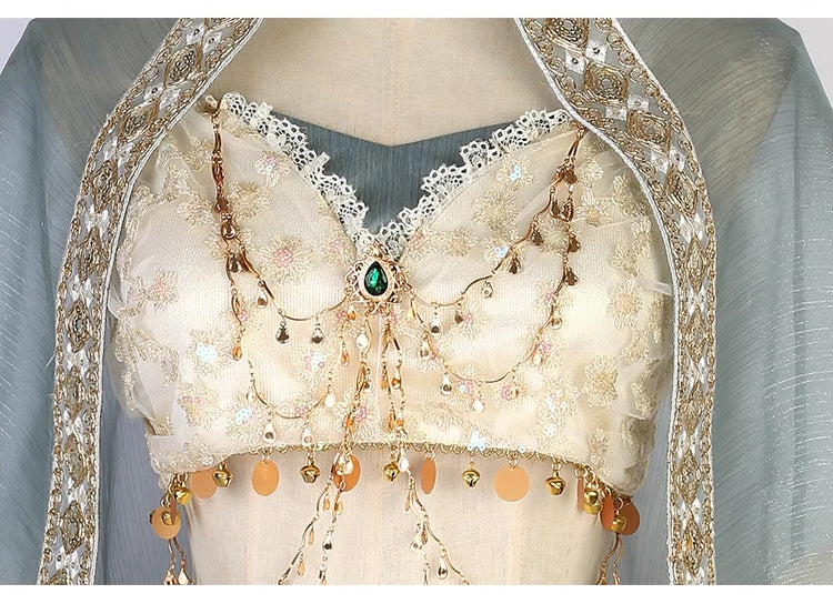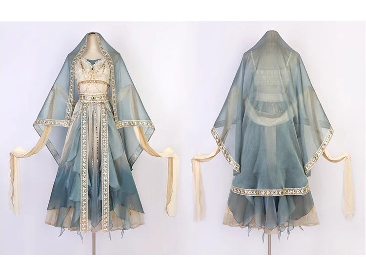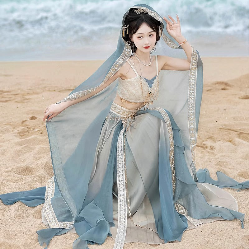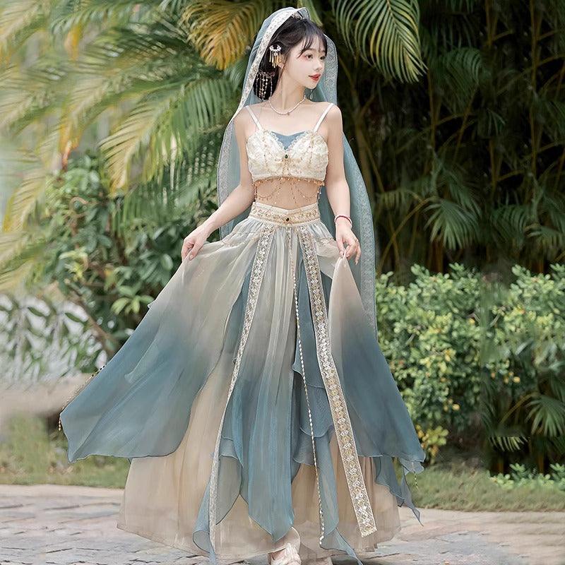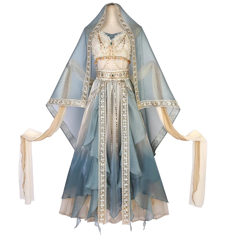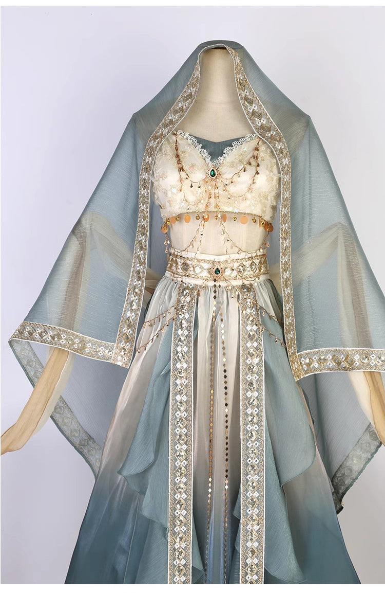 The Dunhuang costume is a traditional attire originating from the Dunhuang region in northwest China, along the historic Silk Road. This unique garment is a blend of Central Asian, Tibetan, Indian, and Chinese influences, highlighting the rich cultural interactions that took place in the area. Characterized by its vibrant colors, the costume embodies the region's artistic aesthetics and beliefs. Wearing this attire allows you to connect with the past, celebrate cultural diversity, and appreciate the timeless beauty that crosses both time and borders.