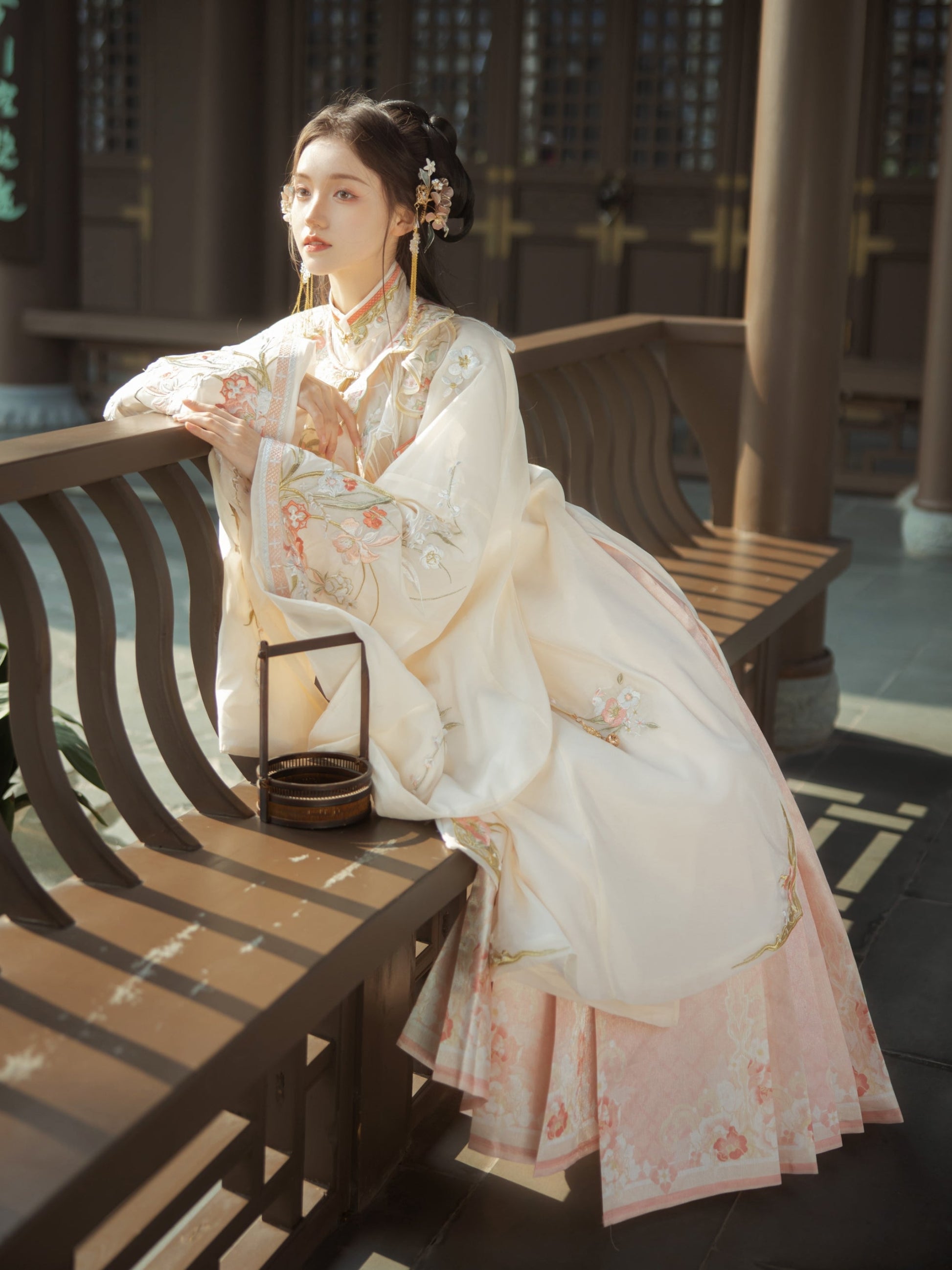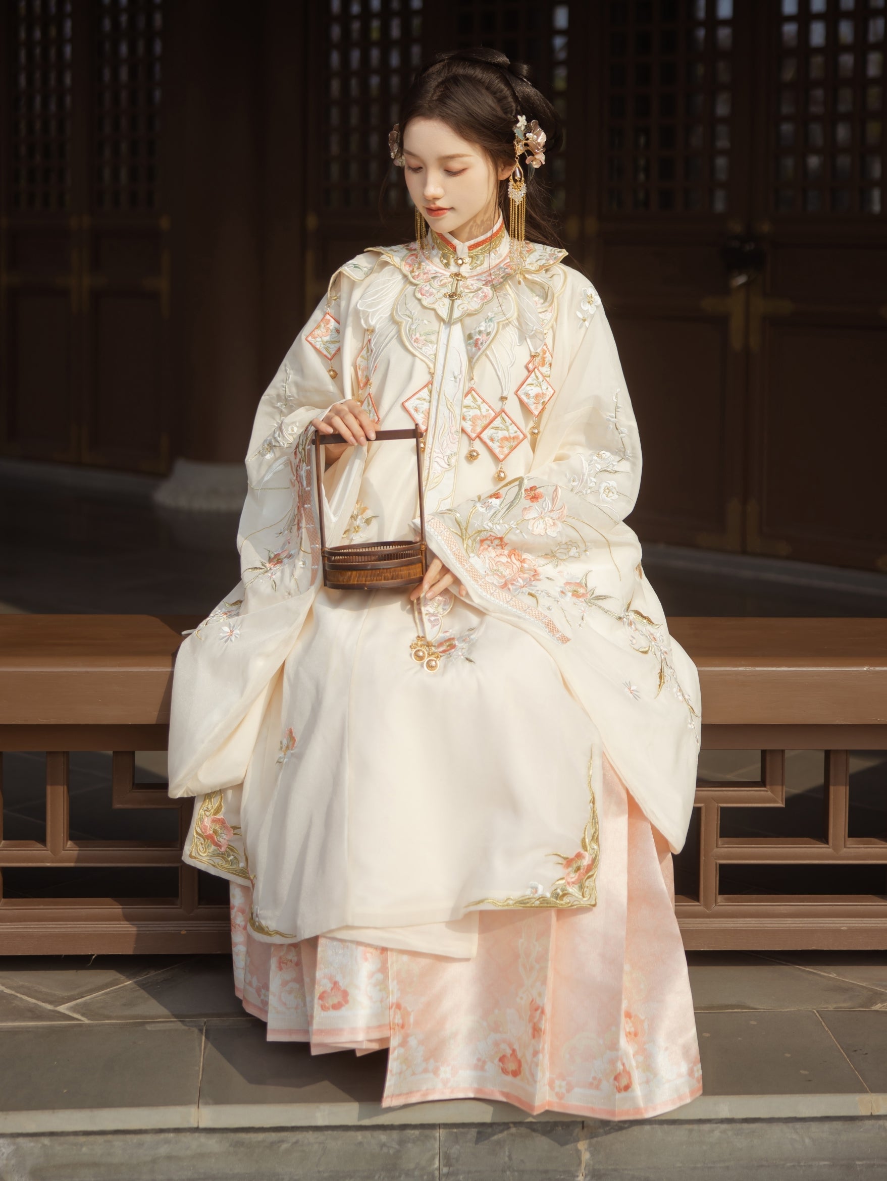 Shop Ming Dynasty women’s fashion, featuring structured Mamian skirts, embroidered cloud shoulders, and flowing robes. These historical Chinese garments are perfect for cultural events, festivals, performances, and even wedding or graduation ceremonies.