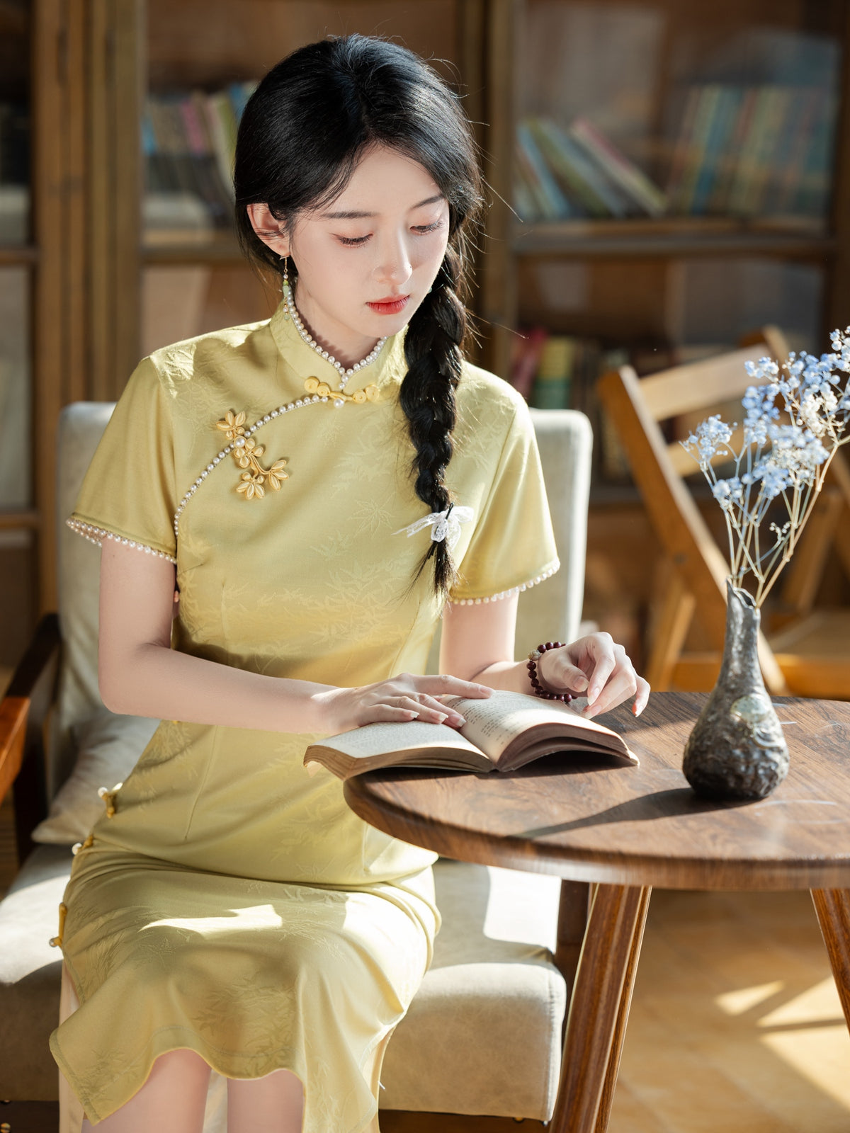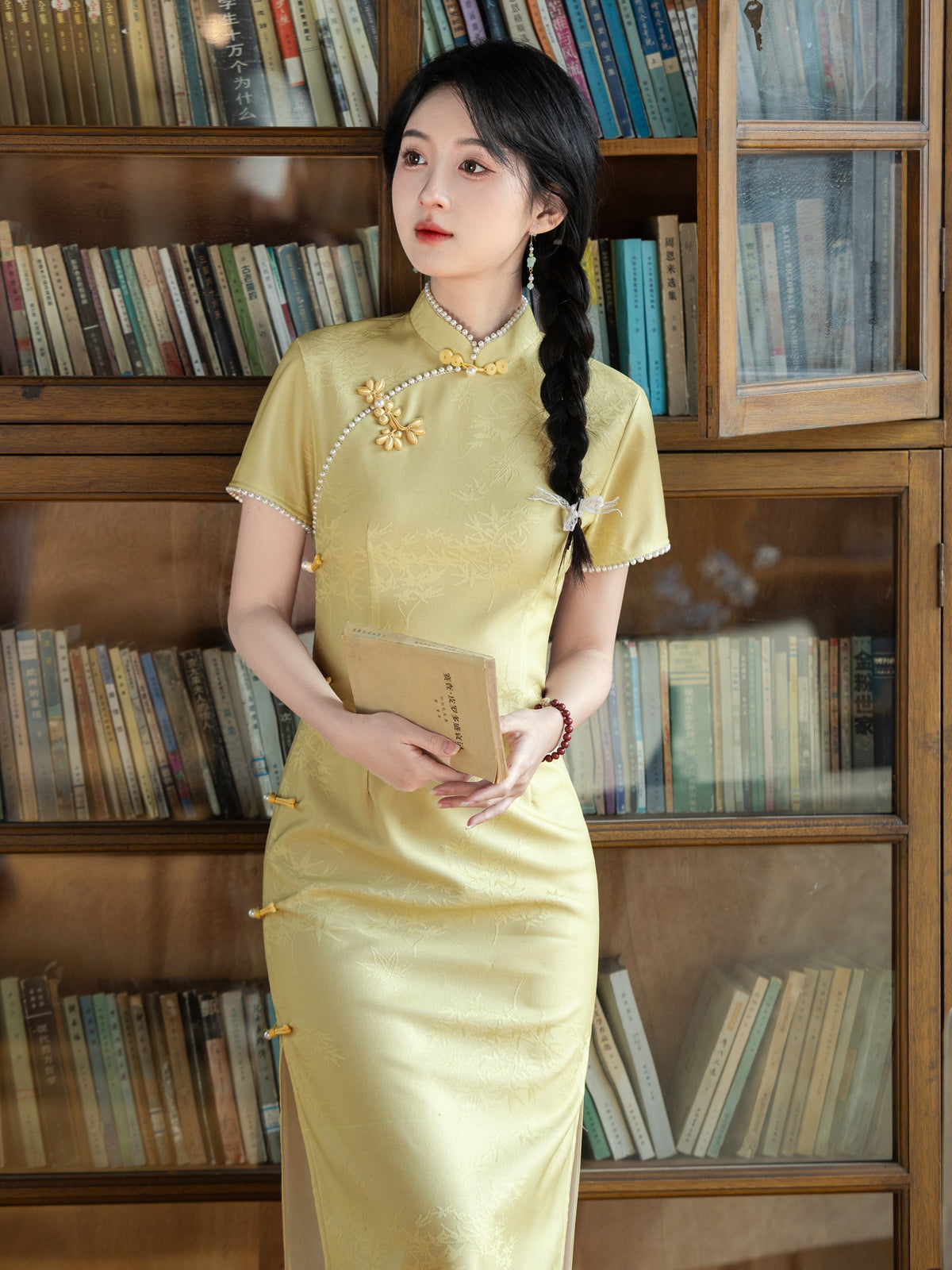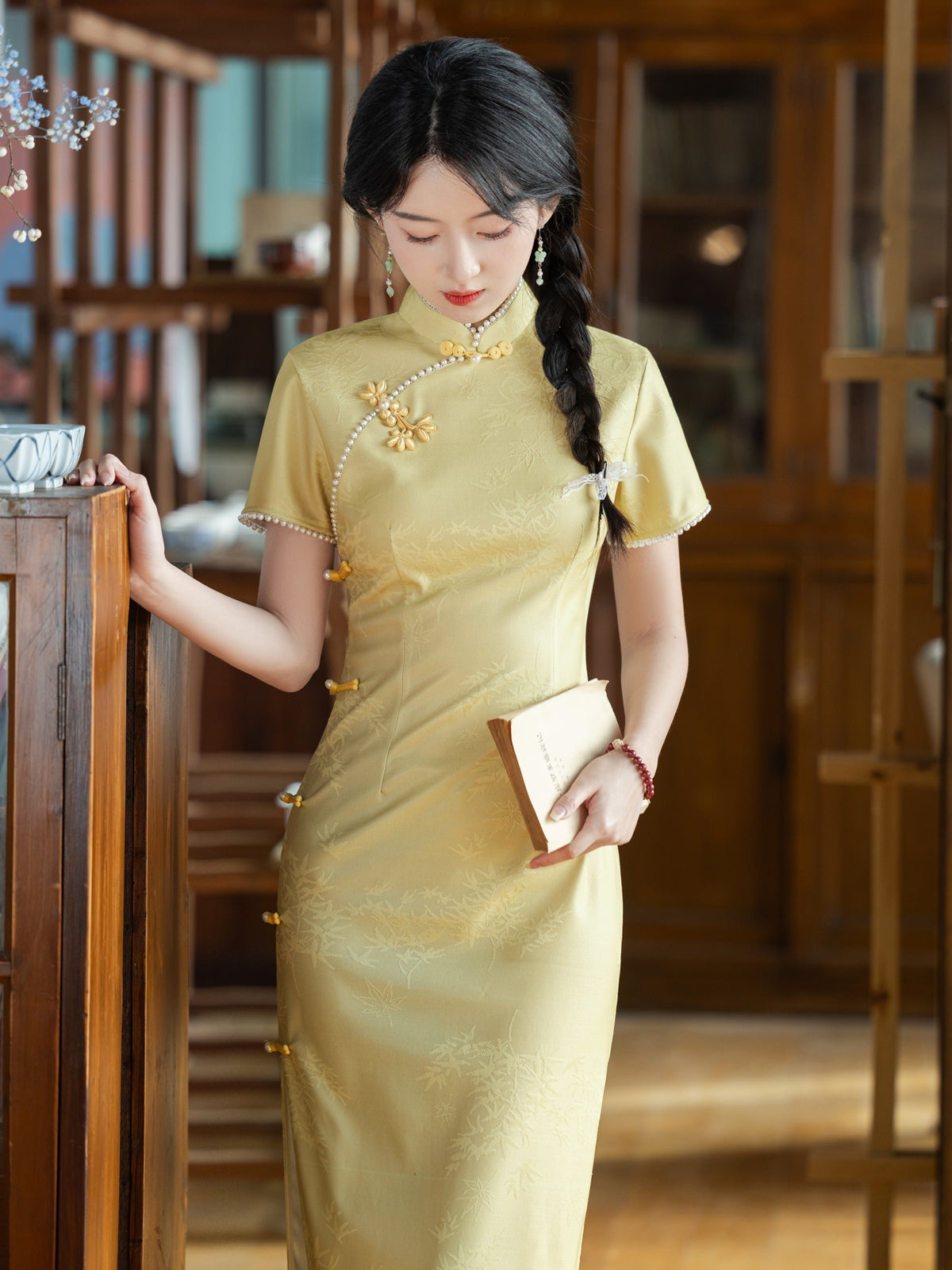 Fusu 扶苏 - Short Sleeve Vintage Yellow Midi Cheongsam
