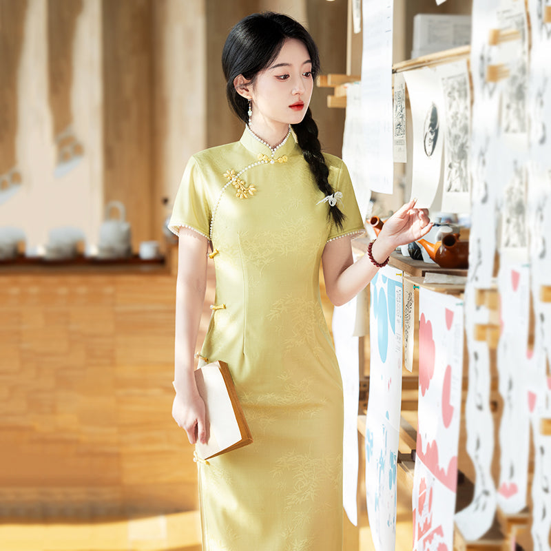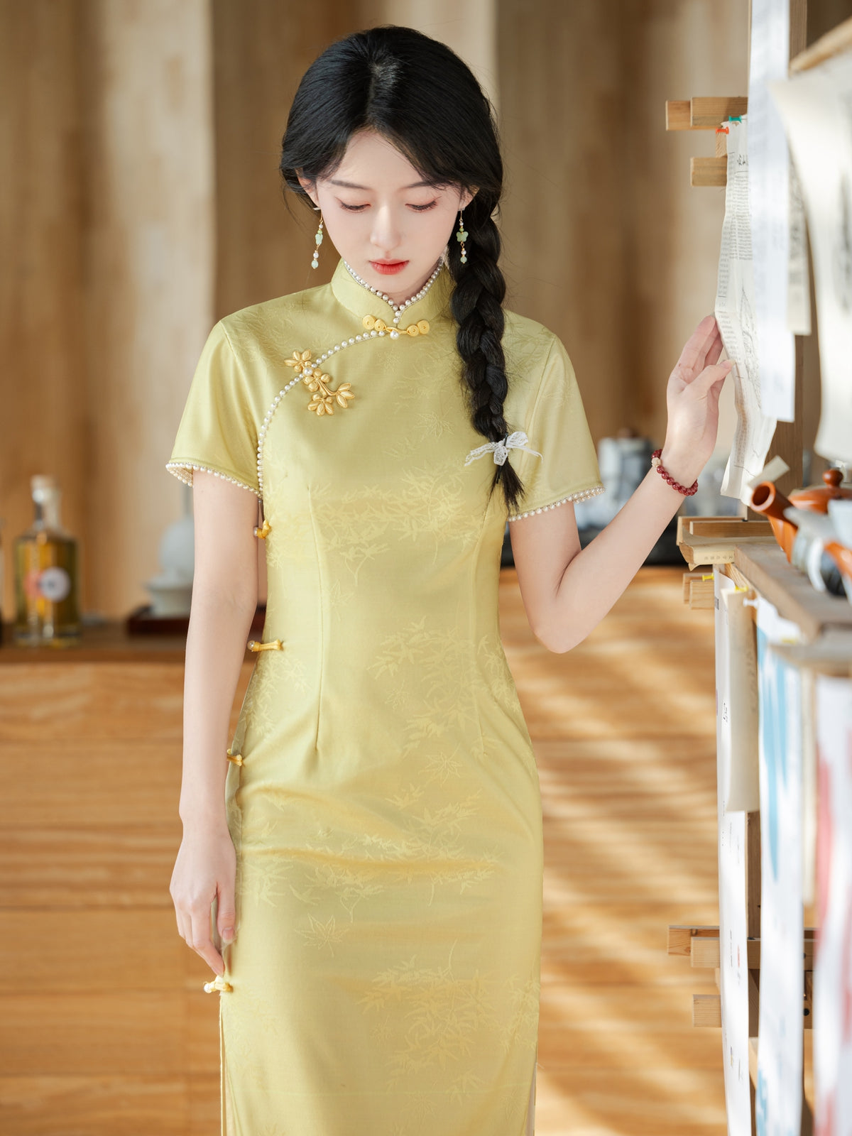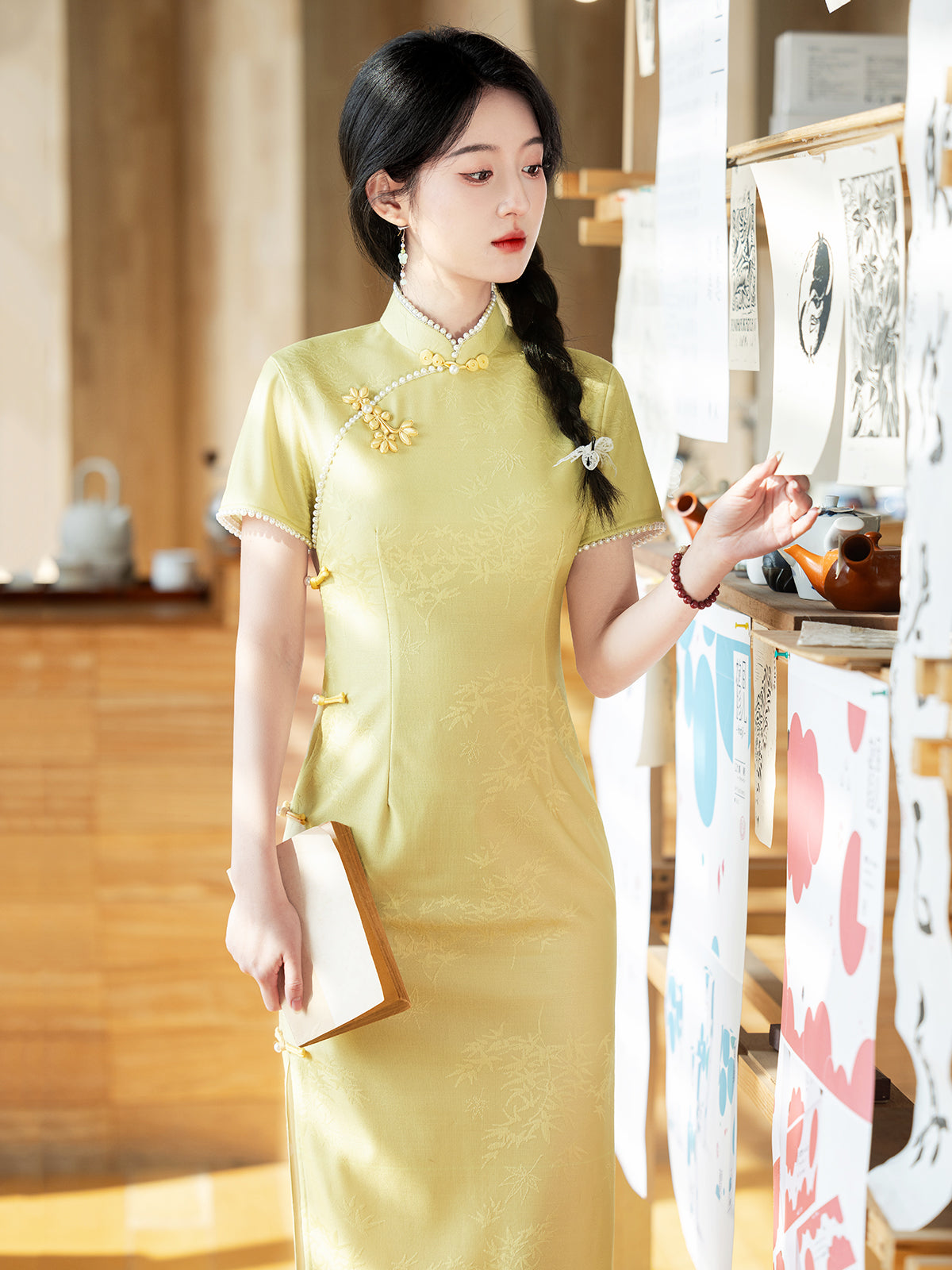 Fusu 扶苏 - Short Sleeve Vintage Yellow Midi Cheongsam