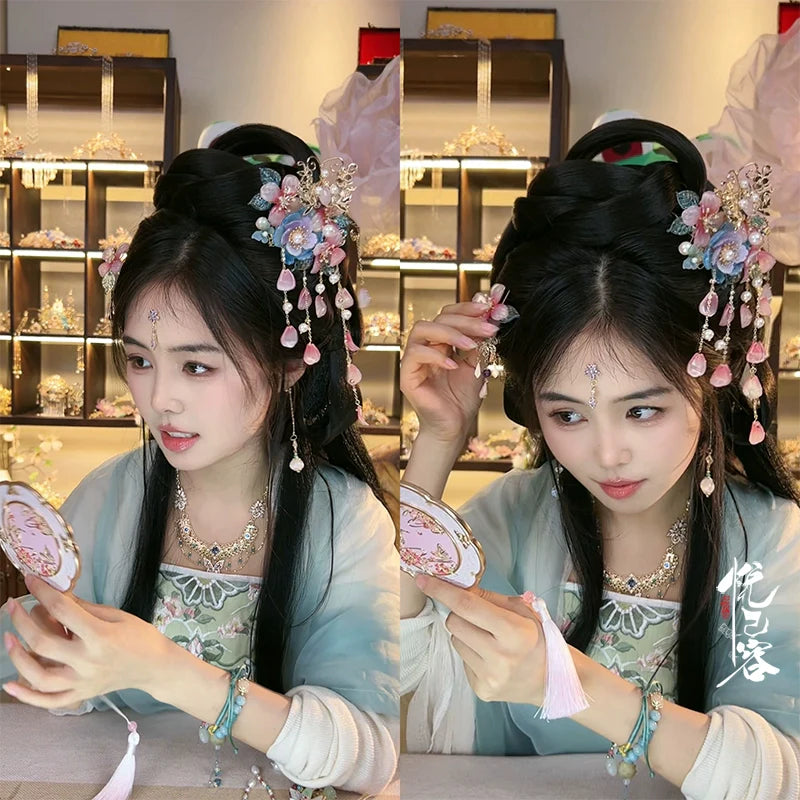In traditional Hanfu culture, the hairstyle and the accompanying accessories are considered important elements that complete the overall look and reflect the wearer's social status, fashion sense, and personal style.