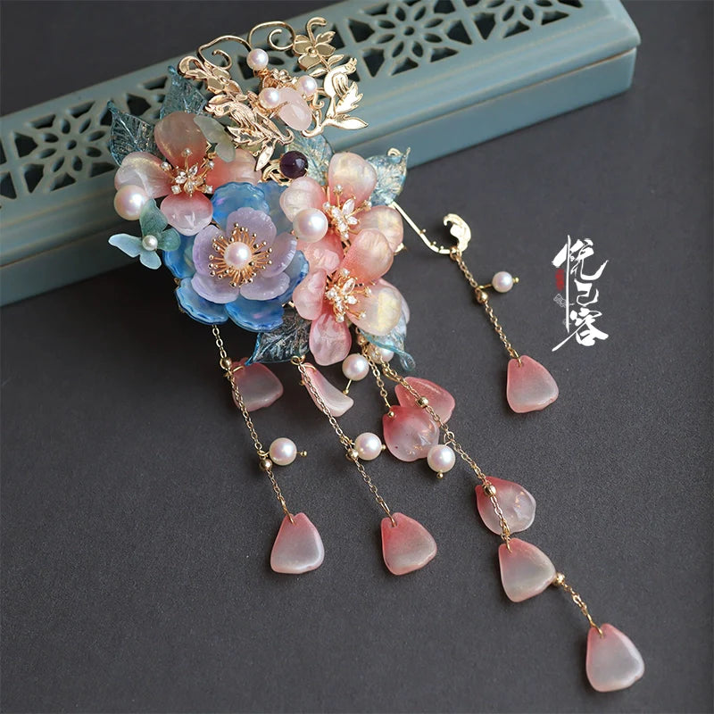 Hanfu hair accessories can vary widely in style, material, and design, but they all serve the purpose of enhancing the wearer's appearance and adding an extra touch of elegance to their hair. Some notable hair accessories commonly associated with Hanfu are hairpins (发簪, fāzān), hair combs (发篦, fābì), tassels (流苏, liúsū), hair ornaments (发髻, fājì), hairbands and headpieces (发饰, fāshì).