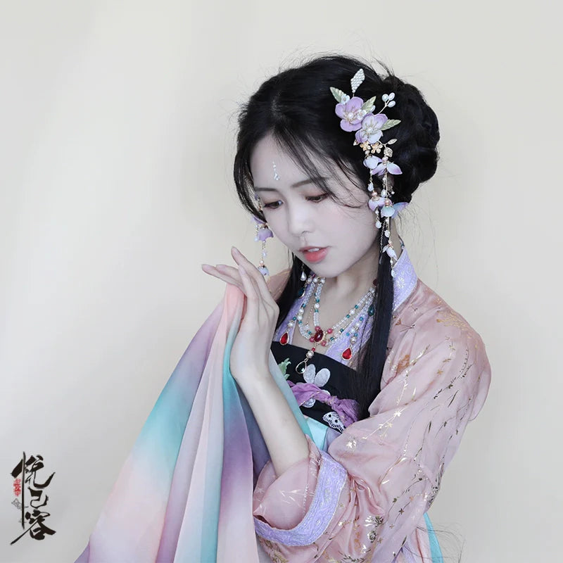 In traditional Hanfu culture, the hairstyle and the accompanying accessories are considered important elements that complete the overall look and reflect the wearer's social status, fashion sense, and personal style.