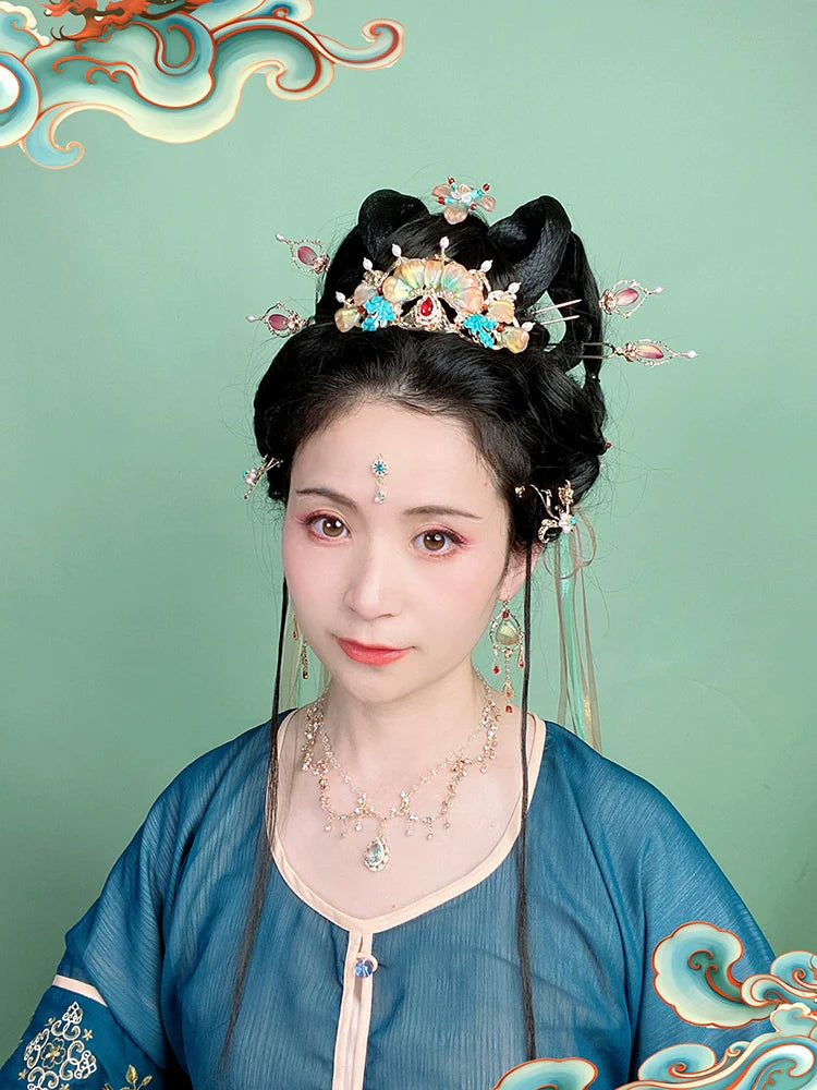 In traditional Hanfu culture, the hairstyle and the accompanying accessories are considered important elements that complete the overall look and reflect the wearer's social status, fashion sense, and personal style.