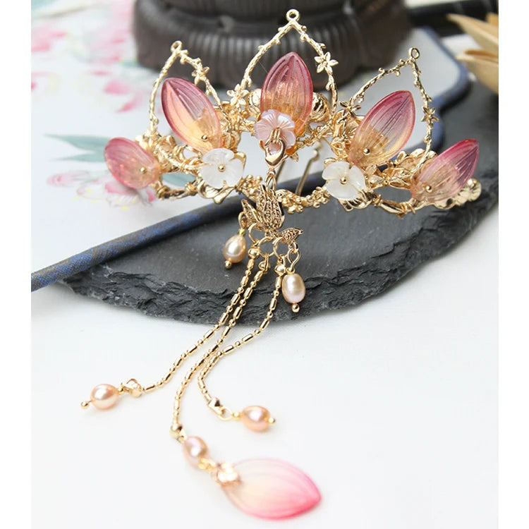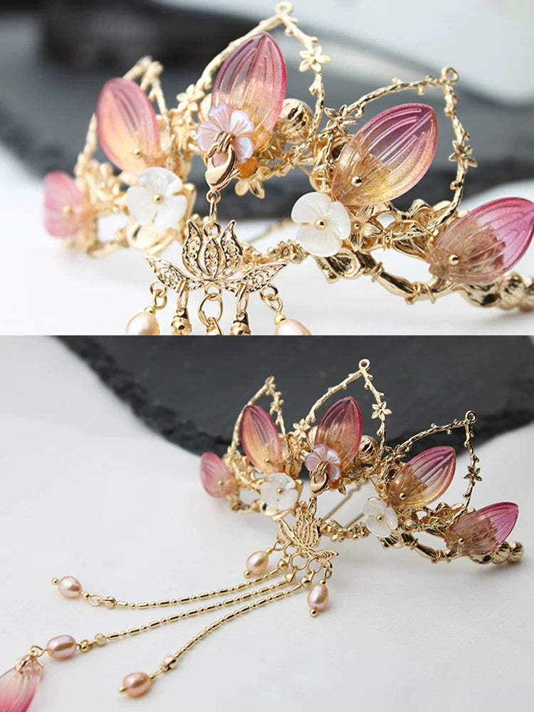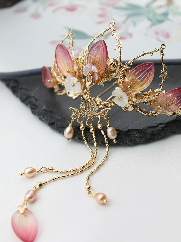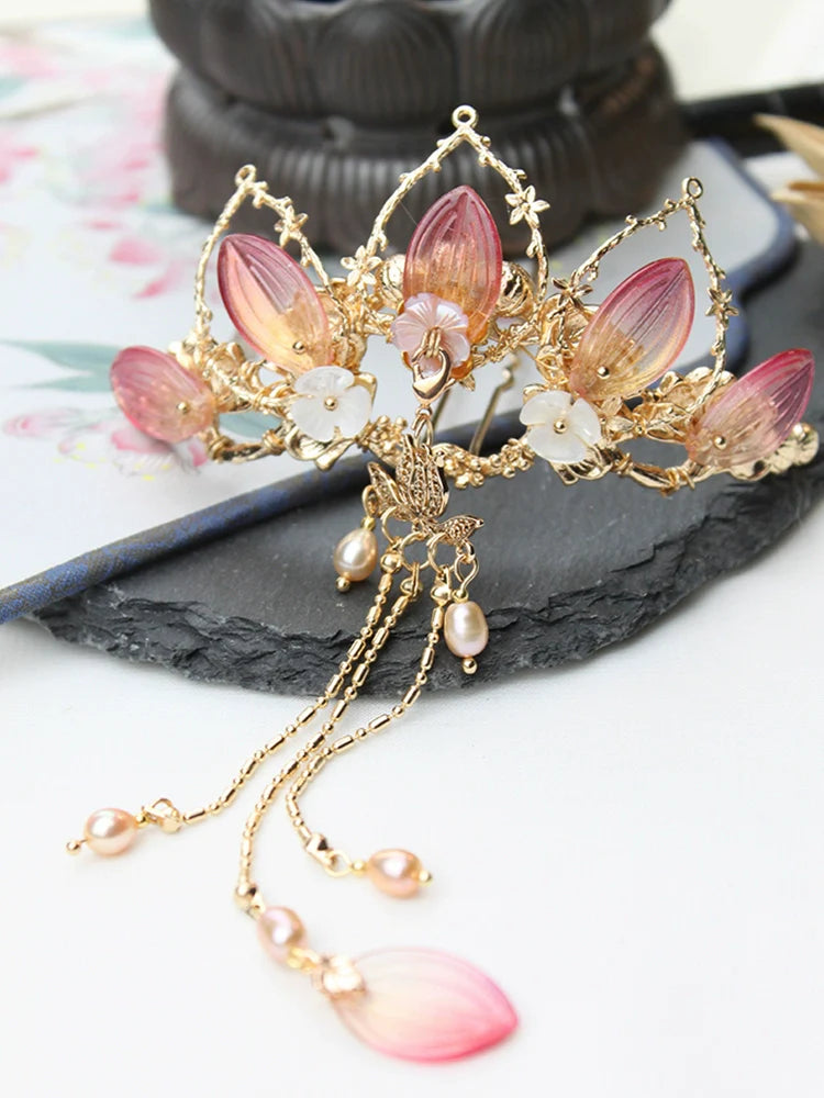 Hanfu hair accessories can vary widely in style, material, and design, but they all serve the purpose of enhancing the wearer's appearance and adding an extra touch of elegance to their hair. Some notable hair accessories commonly associated with Hanfu are hairpins (发簪, fāzān), hair combs (发篦, fābì), tassels (流苏, liúsū), hair ornaments (发髻, fājì), hairbands and headpieces (发饰, fāshì).