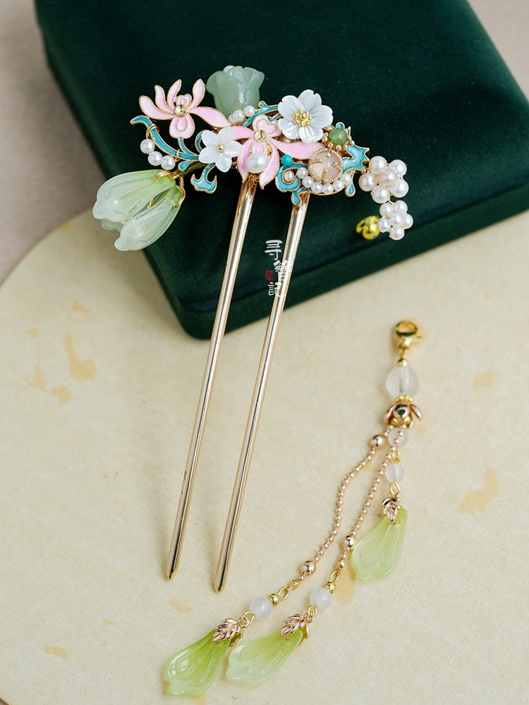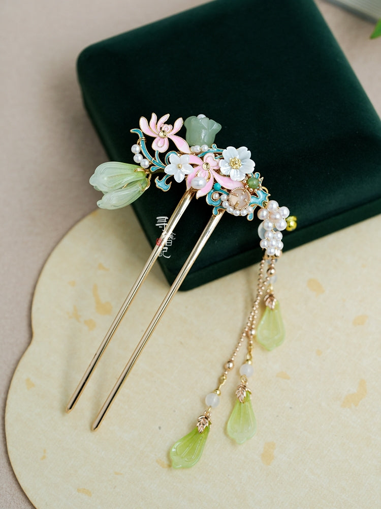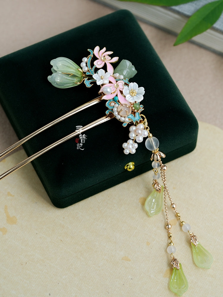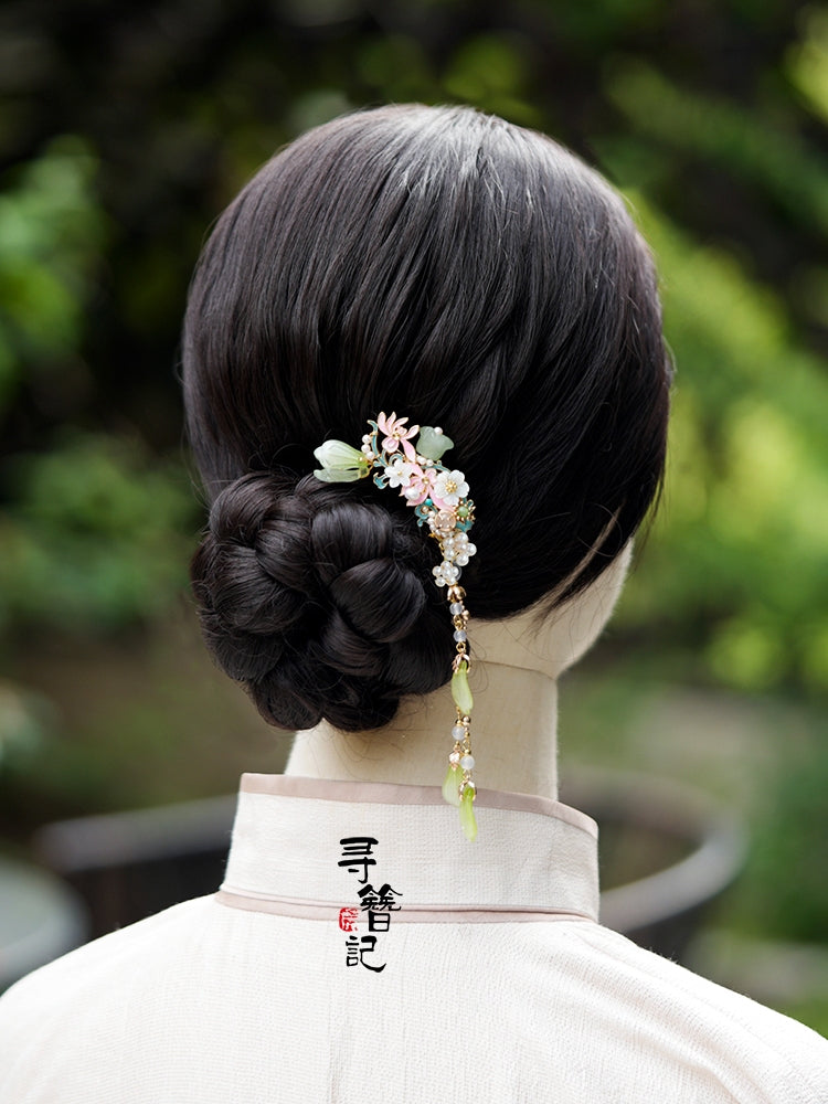 Hanfu hair accessories can vary widely in style, material, and design, but they all serve the purpose of enhancing the wearer's appearance and adding an extra touch of elegance to their hair. Some notable hair accessories commonly associated with Hanfu are hairpins (发簪, fāzān), hair combs (发篦, fābì), tassels (流苏, liúsū), hair ornaments (发髻, fājì), hairbands and headpieces (发饰, fāshì).