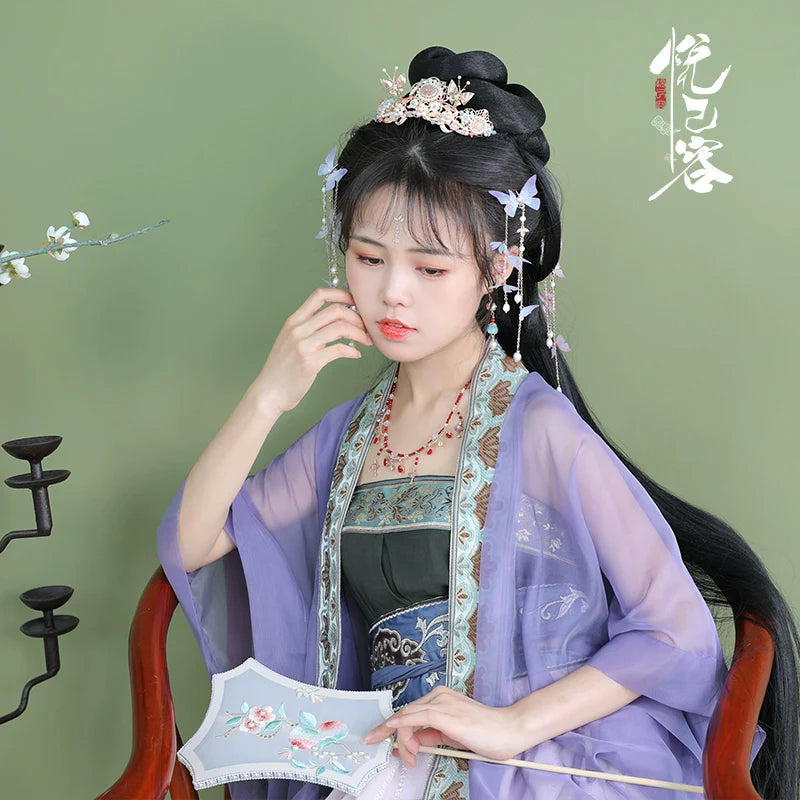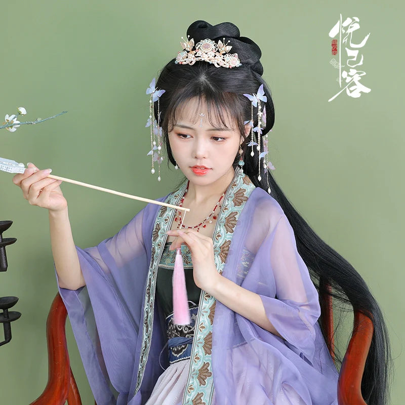 In traditional Hanfu culture, the hairstyle and the accompanying accessories are considered important elements that complete the overall look and reflect the wearer's social status, fashion sense, and personal style.
