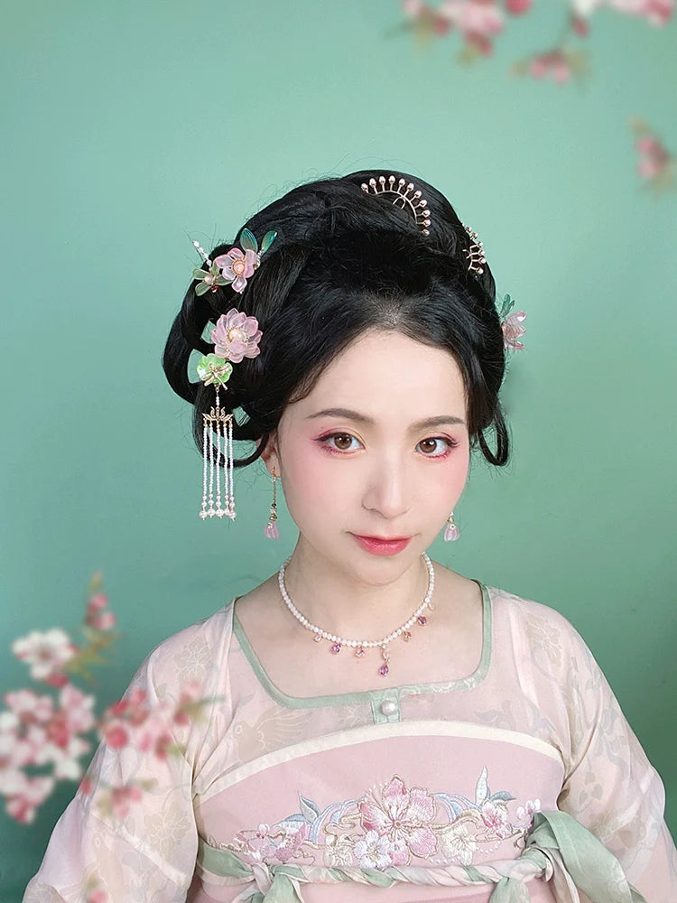 In traditional Hanfu culture, the hairstyle and the accompanying accessories are considered important elements that complete the overall look and reflect the wearer's social status, fashion sense, and personal style.