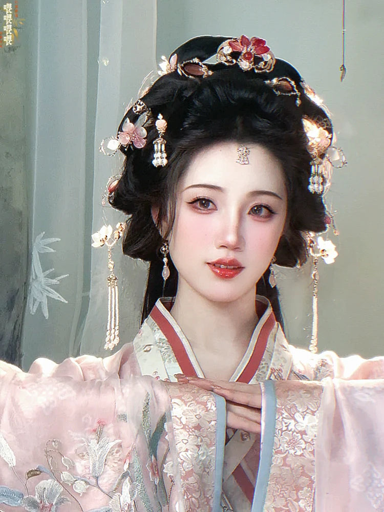 In traditional Hanfu culture, the hairstyle and the accompanying accessories are considered important elements that complete the overall look and reflect the wearer's social status, fashion sense, and personal style.