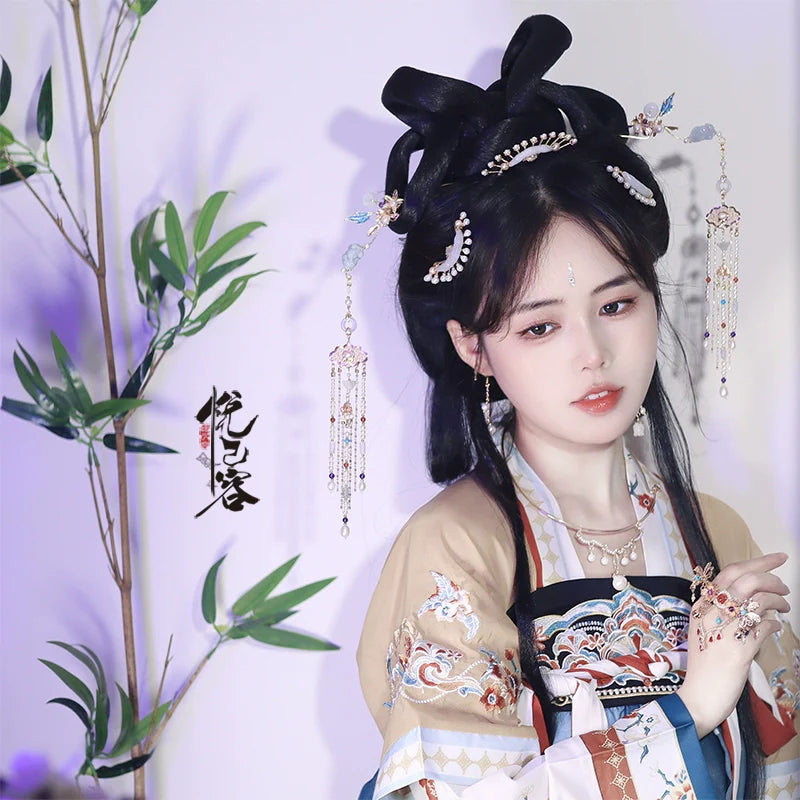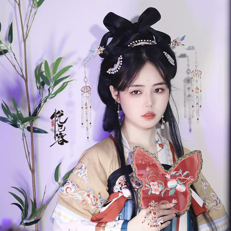 In traditional Hanfu culture, the hairstyle and the accompanying accessories are considered important elements that complete the overall look and reflect the wearer's social status, fashion sense, and personal style.