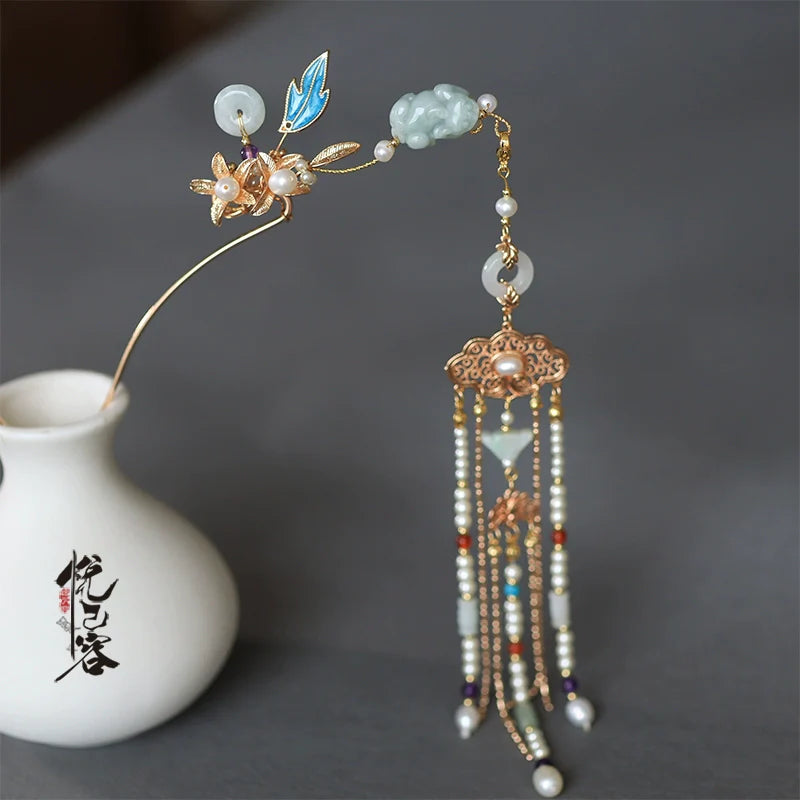 Hanfu hair accessories can vary widely in style, material, and design, but they all serve the purpose of enhancing the wearer's appearance and adding an extra touch of elegance to their hair. Some notable hair accessories commonly associated with Hanfu are hairpins (发簪, fāzān), hair combs (发篦, fābì), tassels (流苏, liúsū), hair ornaments (发髻, fājì), hairbands and headpieces (发饰, fāshì).