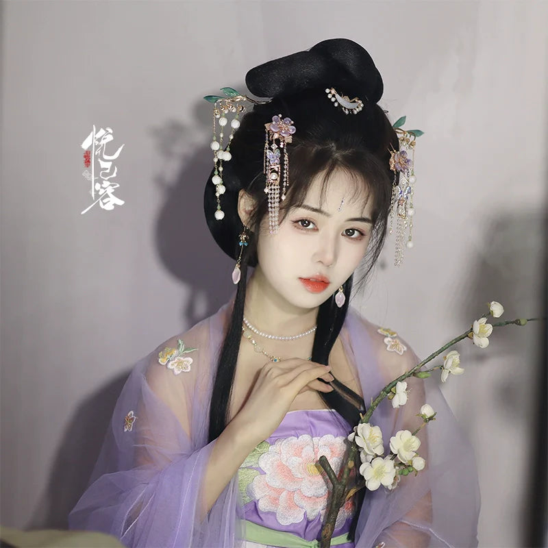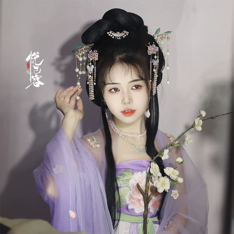 In traditional Hanfu culture, the hairstyle and the accompanying accessories are considered important elements that complete the overall look and reflect the wearer's social status, fashion sense, and personal style.