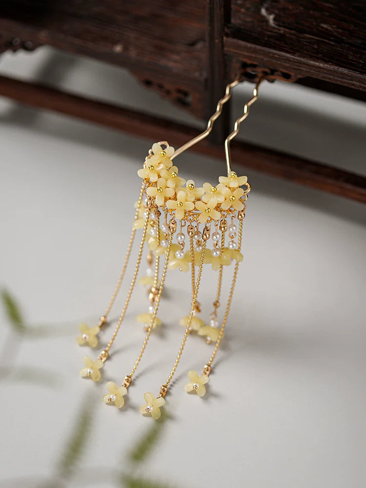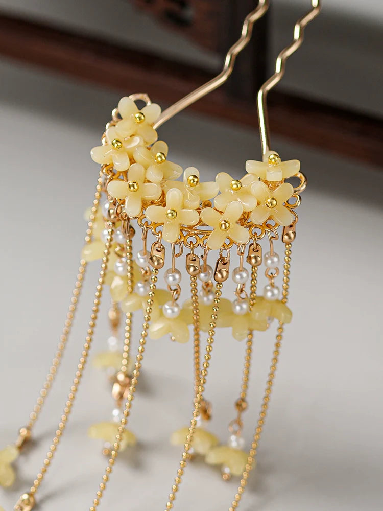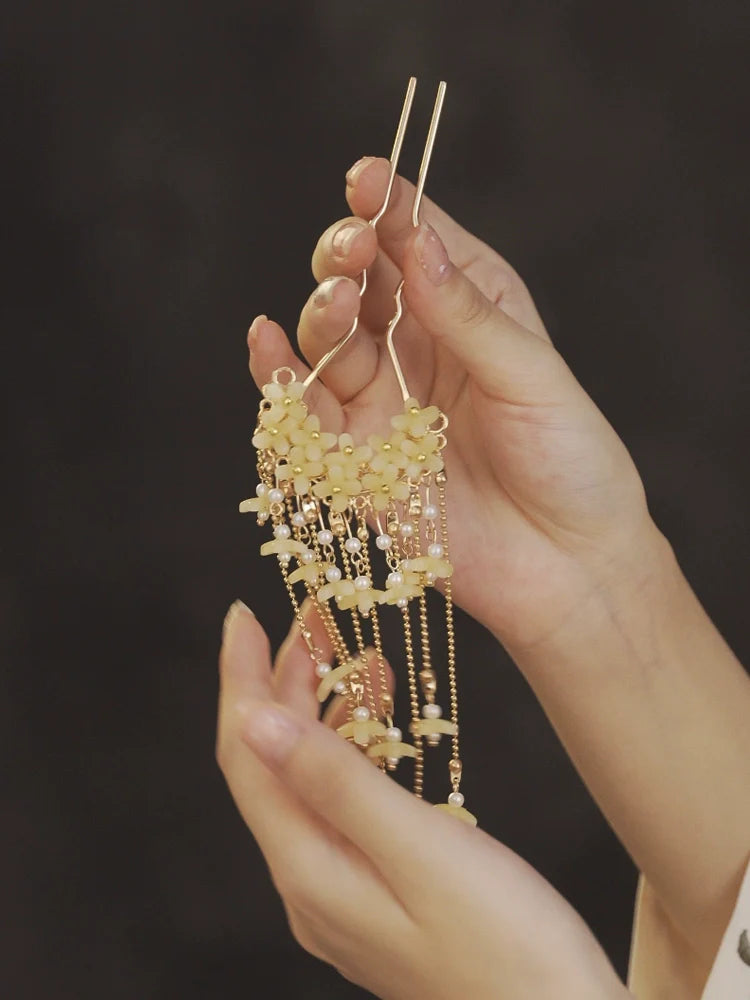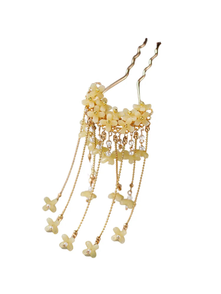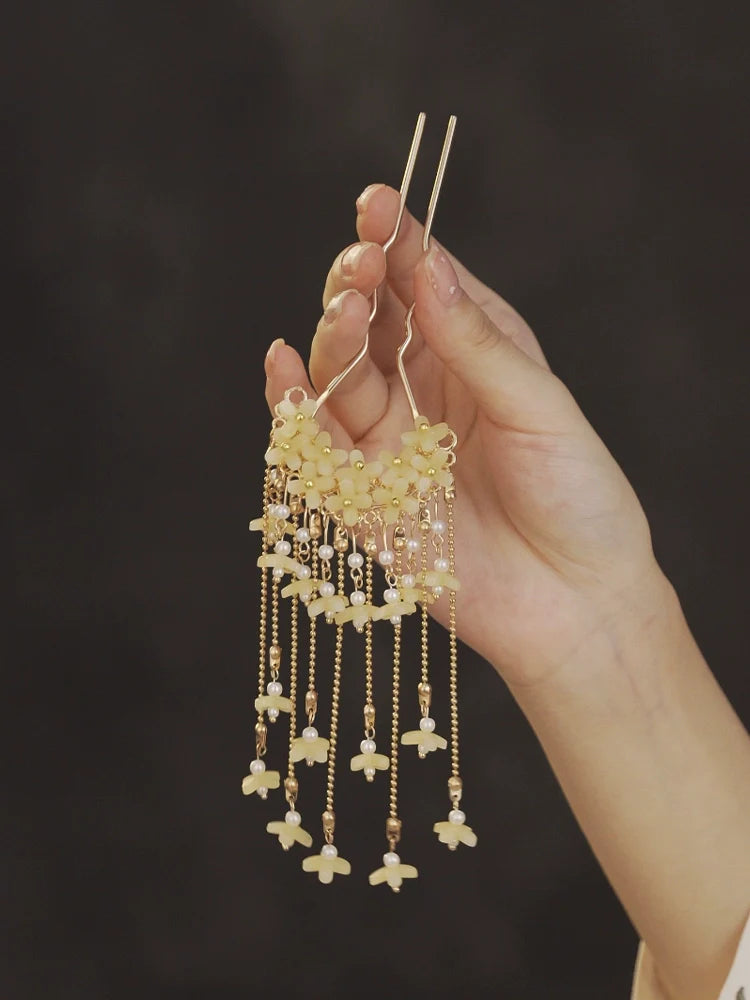 Hanfu hair accessories can vary widely in style, material, and design, but they all serve the purpose of enhancing the wearer's appearance and adding an extra touch of elegance to their hair. Some notable hair accessories commonly associated with Hanfu are hairpins (发簪, fāzān), hair combs (发篦, fābì), tassels (流苏, liúsū), hair ornaments (发髻, fājì), hairbands and headpieces (发饰, fāshì).