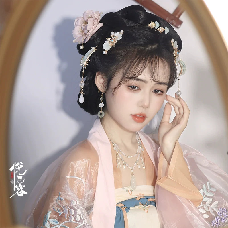 In traditional Hanfu culture, the hairstyle and the accompanying accessories are considered important elements that complete the overall look and reflect the wearer's social status, fashion sense, and personal style.