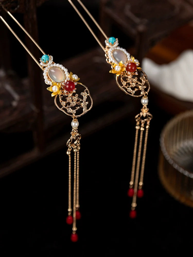 Hanfu hair accessories can vary widely in style, material, and design, but they all serve the purpose of enhancing the wearer's appearance and adding an extra touch of elegance to their hair. Some notable hair accessories commonly associated with Hanfu are hairpins (发簪, fāzān), hair combs (发篦, fābì), tassels (流苏, liúsū), hair ornaments (发髻, fājì), hairbands and headpieces (发饰, fāshì).