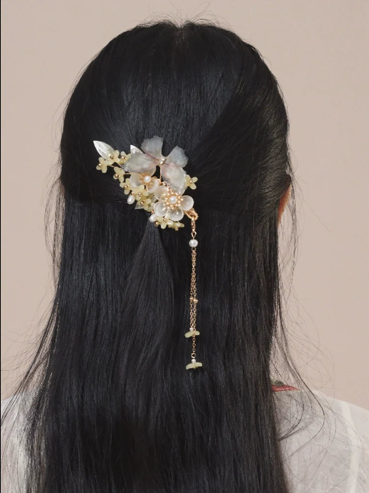 Hanfu hair accessories can vary widely in style, material, and design, but they all serve the purpose of enhancing the wearer's appearance and adding an extra touch of elegance to their hair. Some notable hair accessories commonly associated with Hanfu are hairpins (发簪, fāzān), hair combs (发篦, fābì), tassels (流苏, liúsū), hair ornaments (发髻, fājì), hairbands and headpieces (发饰, fāshì).