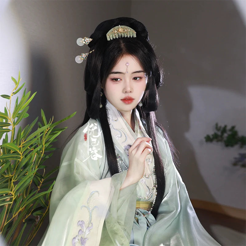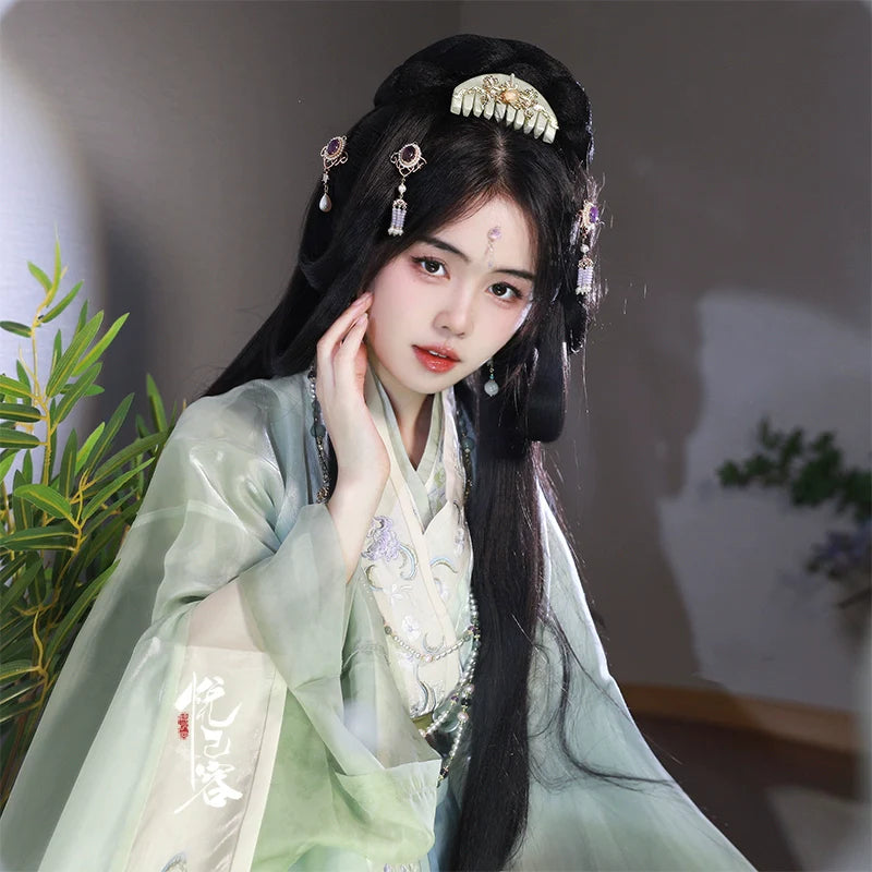 In traditional Hanfu culture, the hairstyle and the accompanying accessories are considered important elements that complete the overall look and reflect the wearer's social status, fashion sense, and personal style.