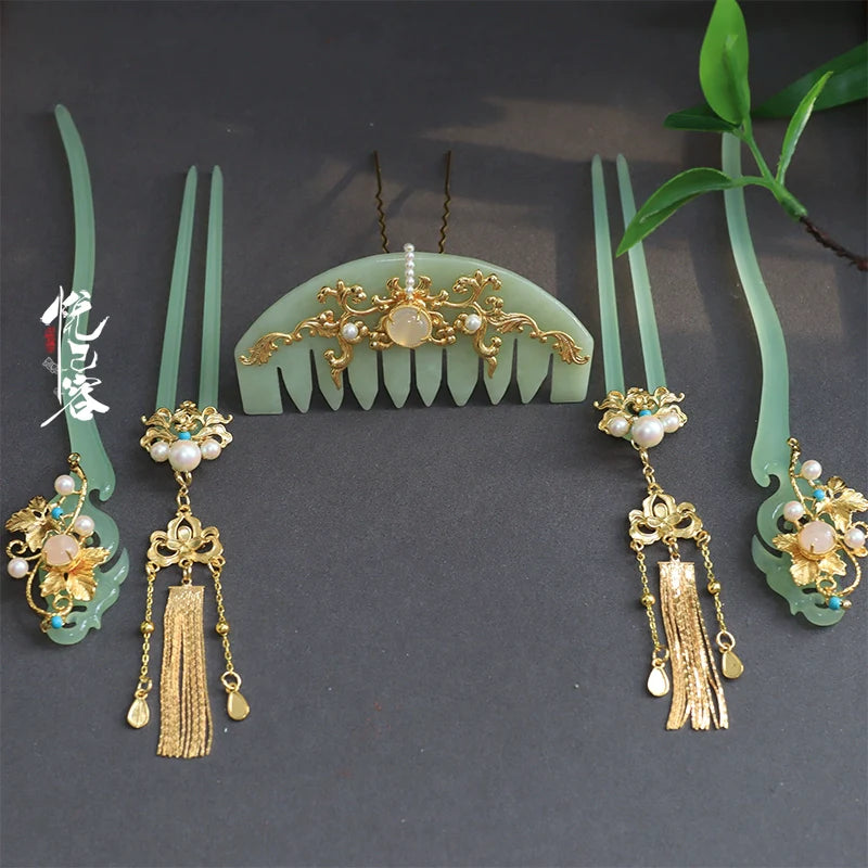 Hanfu hair accessories can vary widely in style, material, and design, but they all serve the purpose of enhancing the wearer's appearance and adding an extra touch of elegance to their hair. Some notable hair accessories commonly associated with Hanfu are hairpins (发簪, fāzān), hair combs (发篦, fābì), tassels (流苏, liúsū), hair ornaments (发髻, fājì), hairbands and headpieces (发饰, fāshì).