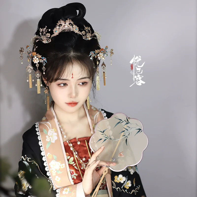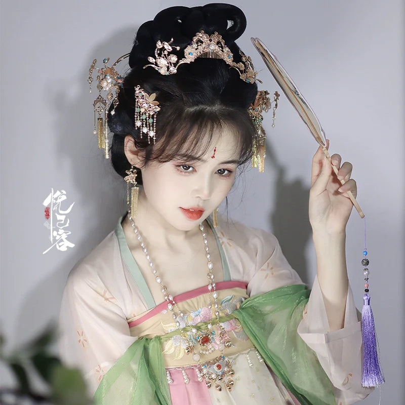 In traditional Hanfu culture, the hairstyle and the accompanying accessories are considered important elements that complete the overall look and reflect the wearer's social status, fashion sense, and personal style.