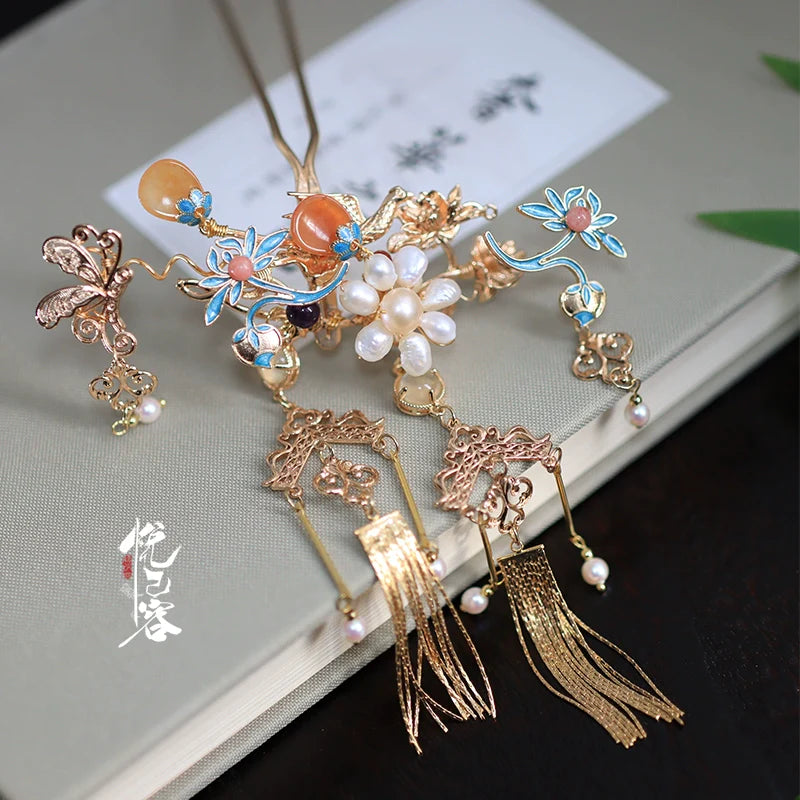 Hanfu hair accessories can vary widely in style, material, and design, but they all serve the purpose of enhancing the wearer's appearance and adding an extra touch of elegance to their hair. Some notable hair accessories commonly associated with Hanfu are hairpins (发簪, fāzān), hair combs (发篦, fābì), tassels (流苏, liúsū), hair ornaments (发髻, fājì), hairbands and headpieces (发饰, fāshì).