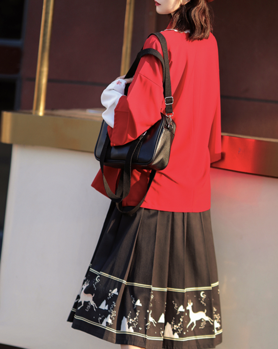 Complete Set: Cardigan, Collared-neck Shirt, Wrapped Flare Midi Skirt