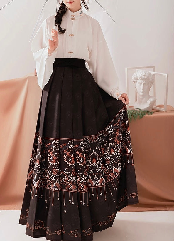 Complete Set: Collared-neck Shirt, Wrapped Flare Midi Skirt