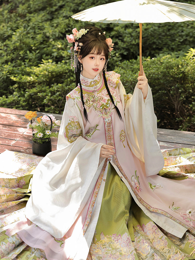 Shop Ming Dynasty women’s fashion, featuring structured Mamian skirts, embroidered cloud shoulders, and flowing robes. These historical Chinese garments are perfect for cultural events, festivals, performances, and even wedding or graduation ceremonies.