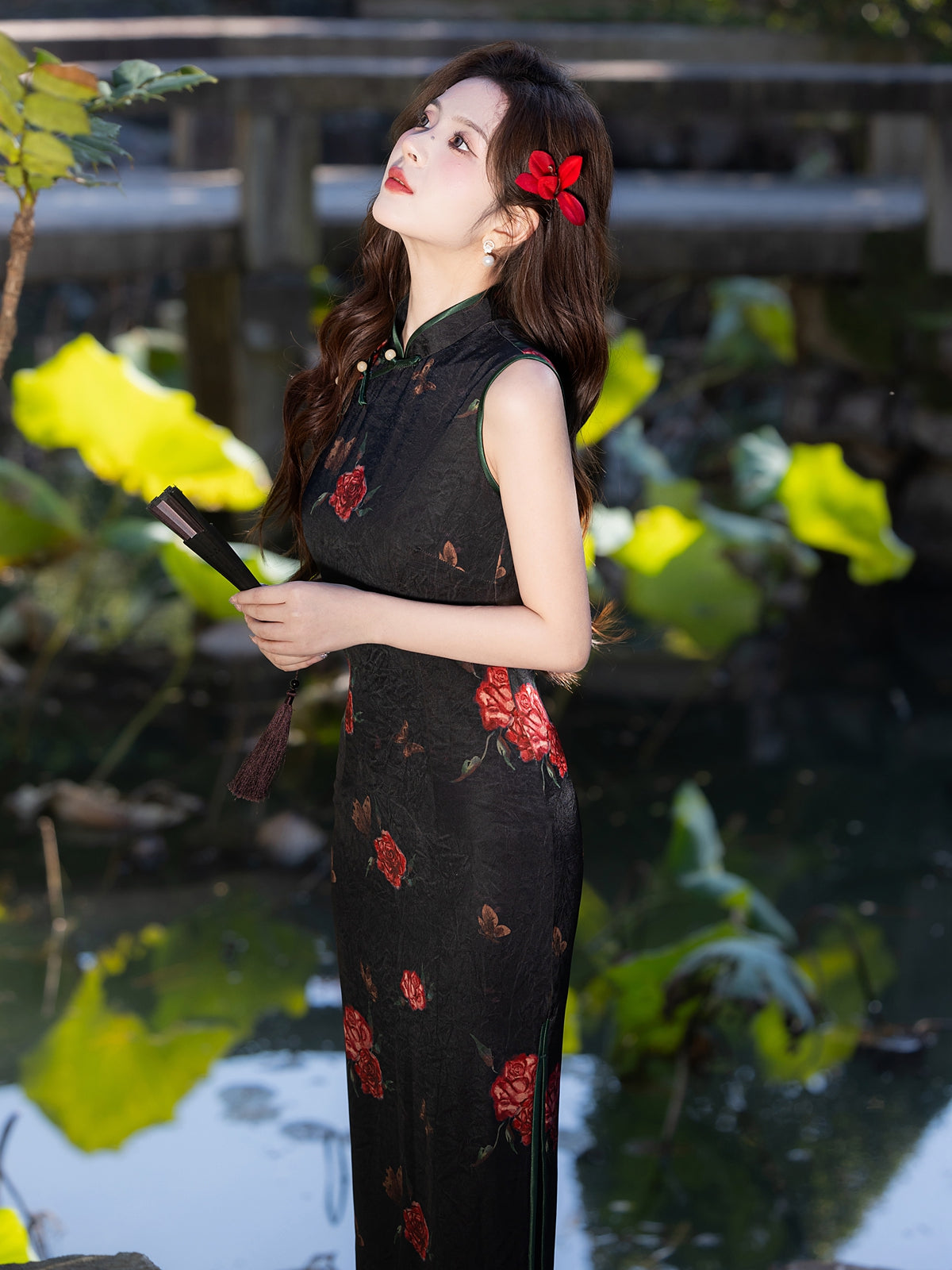 Jade Pillow 玉枕 - Sleeveless Black Flower Long Cheongsam