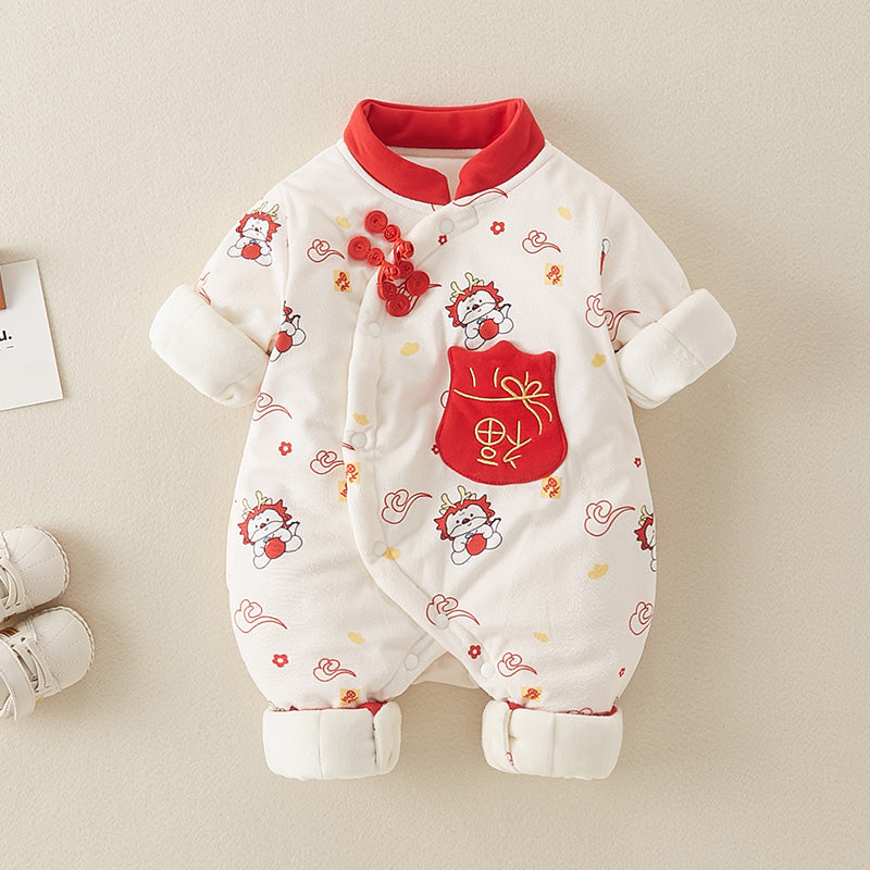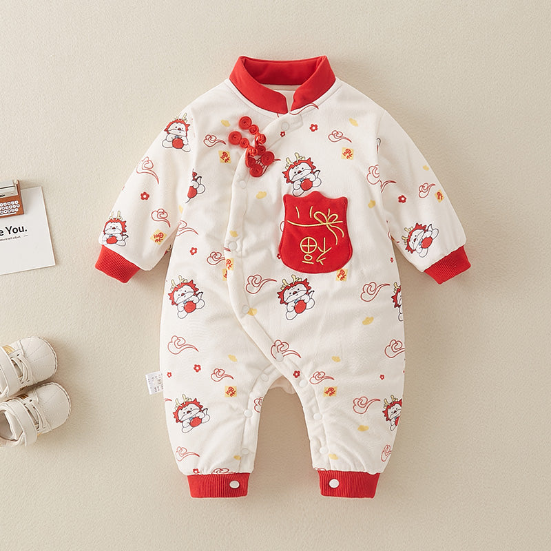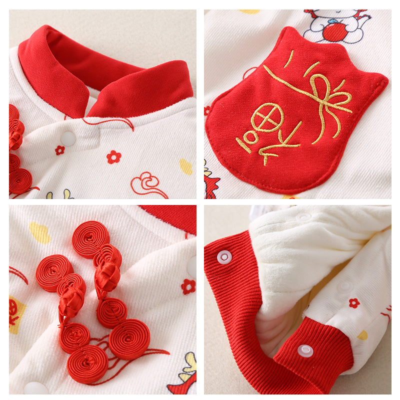 Our baby onesies combine traditional Chinese fashion with modern comfort, inspired by Hanfu and Cheongsam styles. Perfect for Chinese New Year, Mid-Autumn, and first birthdays. Suitable for 10-18 degrees celsius.